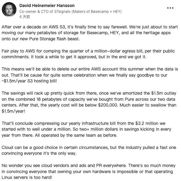 几年前,37Signals 的联合创始人兼 CTO、也是 Ruby on Rails 的作者 David Heinemeier Hansson(DHH)算了一笔账:公司每年花在云服务上总共花费了 3,201,564 美元,相当于每月 266,797 美元,实在太烧钱了。于是在经过一番评估之后,他高调宣布,将带领团队"下云"——把服务从 AWS、Google 等云 服务上迁回自建的数据中心。彼时粗略估算,这一决策将在接下来的 5 年里为公司节省至少 700 万美元。 自那以后,DHH 俨然成了"下云"路线的坚定拥护者,每年都会在博客或社交媒体上更新最新进展,分享他们脱离云厂商怀抱的具体做法和节省下来的成 本。 这不,近日他在 LinkedIn 上更新了最新的动态:37signals 即将彻底告别 AWS,将 18PB 数据迁移到自家基础设施,自此将年度基础设施账单从开始时的 320 万美元压缩到远低于 100 万美元,完成了"云遣返"。 这不仅让人好奇,他们究竟是怎么做到的?这是否适用于其他公司? "上云"成本太过高昂? "在使用 AWS S3 超过十年之后,我们终于要说再见了。我们即将开始将 Basecamp ...