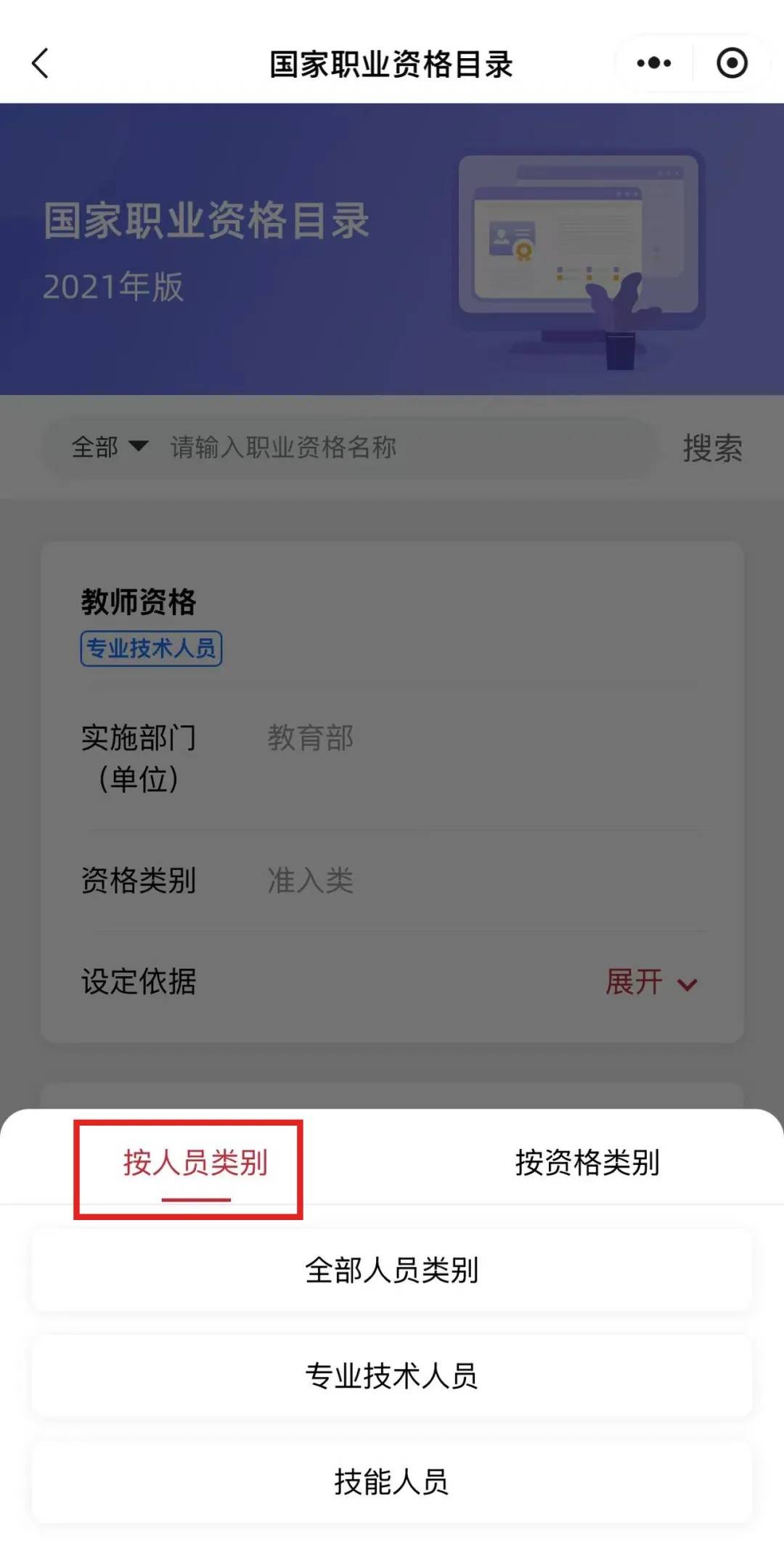 2026年度个税专项附加扣除信息确认 将于2025年12月31日截止 拿证的小伙伴们你们知道吗? 取得职业资格证书 还可以享受继续教育专项附加扣除哦! 你拿到的证书能不能退税? 国家政务服务平台 "国家职业资格目录"服务 可帮你一键查询 步骤一:点击下方卡片进入"国家职业资格目录"服务; 步骤二:进入服务后,根据人员类别、资格类别输入相关名称,点击"搜索"即可。 准入类 资格类别 设定依据 展开 · 按人员类别 按资格类别 全部人员类别 专业技术人员 技能人员 < 国家职业资格目录 O 国家职业资格目录 2021年版 全部 ▼ 请输入职业资格名称 | 教师资格 | | | | --- | --- | --- | | 专业技术人员 | | | | 实施部门 | 教育部 | | | (单位) | | | | 资格类别 | 准入类 | | | 设定依据 | | 展开 v | | 按人员类别 | | 按资格类别 | | | 全部资格类别 | | | | 准入类 | | | | 水平评价类 | | 博营 来源:长江日报 ...