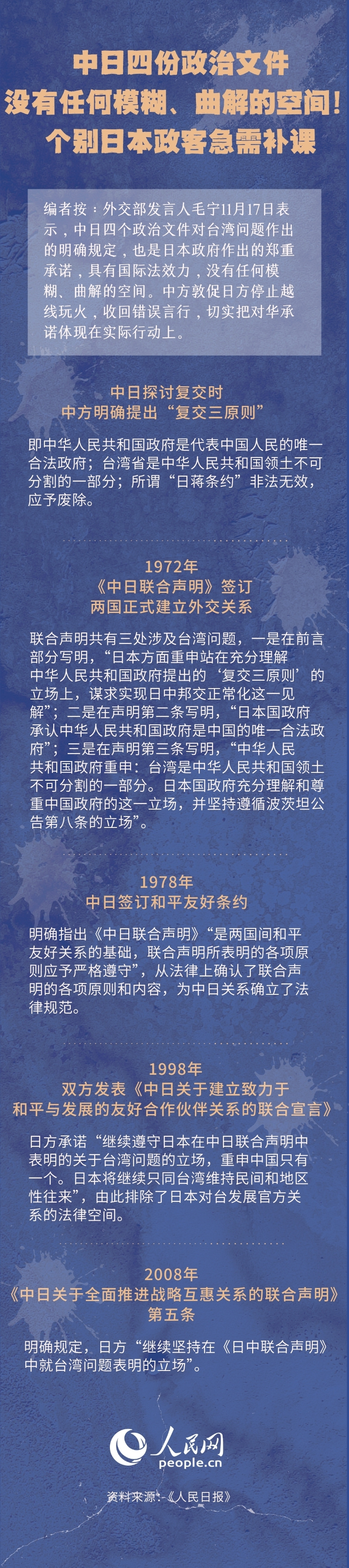 外交部:中日四个政治文件对台湾问题作出明确规定,没有任何模糊、曲解的空间