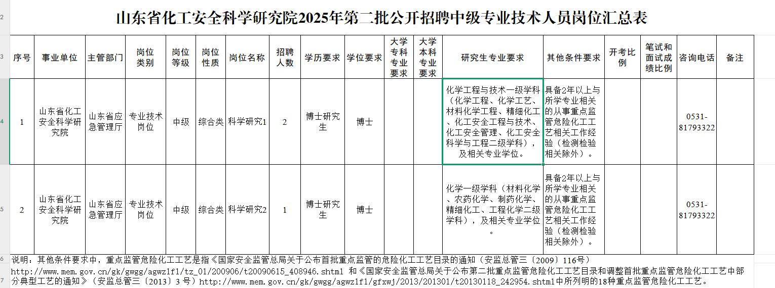 一、单位简介 山东省化工安全科学研究院是山东省应急管理厅所属正处级公益二类事业单位,主要职责是开展化工安全领域科学研究及项目管理、成果推广、交流合作工 作;承担化工安全生产事故监测预警、隐患评估及救援技术支撑工作;承担化工安全有关检验检测工作;承担化工安全宣传教育培训工作;承担危险化学品 登记有关工作。 二、招聘岗位 根据事业单位公开招聘有关规定,结合工作需要,山东省化工安全科学研究院本次拟招聘中级专业技术人员3人。具体岗位及条件详见《山东省化工安全科 学研究院2025年第二批公开招聘中级专业技术人员岗位汇总表》(附件1)。 三、招聘条件 (一)基本条件 1.具有中华人民共和国国籍; 2.年龄在40周岁以下(1984年10月以后出生); 3.遵守中华人民共和国宪法和法律,拥护中国共产党领导和社会主义制度; 4.具有良好的道德品行和适应岗位的身体条件、心理素质; 5.具有招聘岗位要求的专业或技能条件; 6.具有招聘岗位所需的其他条件; 7.法律、法规规定的其他条件。 现役军人,在读的非应届毕业生,因犯罪受过刑事处罚的人员,被开除党籍的人员,被开除公职的人员,被依法列为失信联合惩戒对象的人员,以及法律法 规规定不 ...