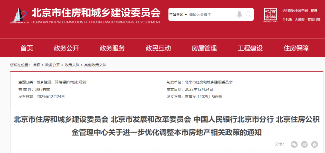 北京市房地产政策优化调整 - 政策自2025年12月24日起施行 旨在更好满足居民刚性住房需求和多样化改善性住房需求 [1] - 放宽非京籍家庭购房条件 购买五环内商品住房的社保或个税缴纳年限由3年调减为2年 购买五环外商品住房的由2年调减为1年 [1] - 支持多子女家庭住房需求 二孩及以上多子女家庭可在五环内多购买一套商品住房 京籍多子女家庭可在五环内购买3套住房 符合连续2年缴纳社保或个税条件的非京籍多子女家庭可在五环内购买2套住房 [1] 个人住房信贷与公积金政策调整 - 优化个人住房信贷政策 银行业金融机构在利率定价机制安排方面不再区分首套住房和二套住房 将根据相关机制要求和机构经营状况、客户风险状况等因素合理确定每笔贷款的具体利率水平 [1] - 加大公积金支持住房消费力度 调整二套住房公积金贷款最低首付比例 由不低于30%调整为不低于25% [2] 房地产开发与营商环境优化 - 调整招拍挂拿地的房地产开发项目立项方式 由市区分级核准调整为区级备案 以优化营商环境并提升房地产投资效率 [2]