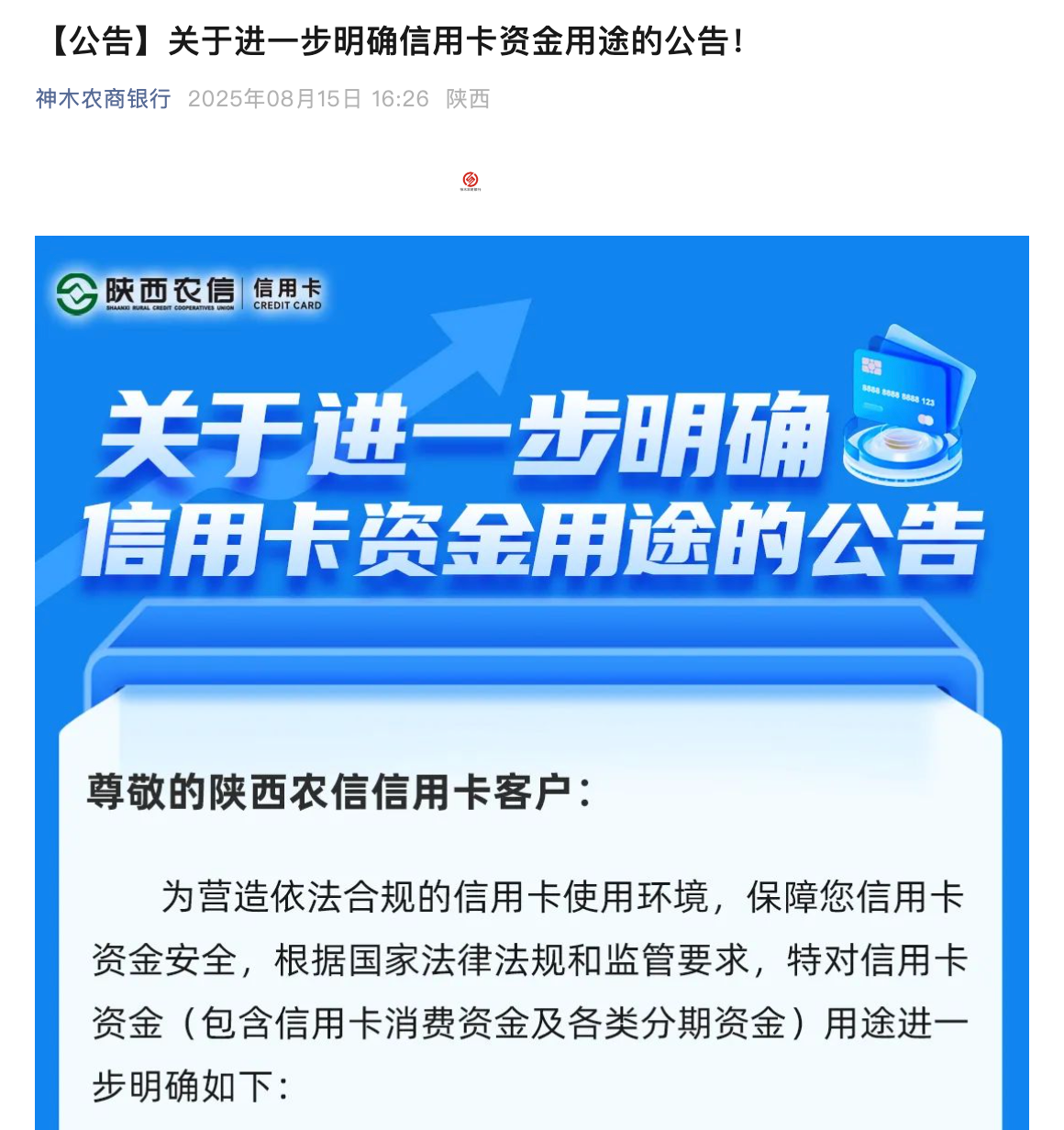 银行监管政策收紧 - 陕西 云南等地农商行明确禁止信用卡资金用于股票 基金 期货 理财产品 虚拟币 投资性贵金属 股权投资等投资理财领域[1][3][6] - 监管要求信用卡资金仅限消费领域使用 不得用于生产经营 固定资产投资 证券市场等非消费领域[6][7] - 银行对违规用卡采取警示提醒 提前终止分期 降额 限制交易 止付等风险管控措施[6] 银行业务合规要求 - 陕西省农村信用社联合社于8月1日率先发布公告 凤翔农商行 渭滨农商行等多家银行陆续跟进明确资金用途九项要求[4] - 民生银行信用卡中心宣布自2025年9月18日起将预借现金转账业务纳入资金受控金额管理[10] - 银行要求持卡人保留与交易用途相符的有效凭证以备核查[6] 监管处罚案例 - 玉树支行因信用卡资金被用于申购基金和购买股票被罚20万元[12] - 长沙市天心支行因信用卡业务管控不到位被罚40万元[12] - 浙商银行因信用卡业务不审慎等事由被罚超千万元[12] 行业发展趋势 - 全国信用卡和借贷合一卡数量从2024年末7.27亿张降至2025年二季度末7.15亿张 减少1200万张[13] - 信用卡业务从规模扩张转向价值创造 注重用户生命周期价值挖掘与客户体验升级[13] - 行业向场景多元化 数字化智能化 生态化协同三大方向发展 重点挖掘下沉市场潜力[13] 政策实施范围 - 自去年10月以来国有大行 股份行及地方性银行等数十家银行发布禁止信用卡资金流入股市声明[7] - 闽清农信联社 福清汇通农商银行 武平杭兴村镇银行等中小银行明确信贷资金不得流入股市[7][8] - 广州市小额贷款行业协会要求小贷公司贷款不得用于股票 金融衍生品等投资[8][9]