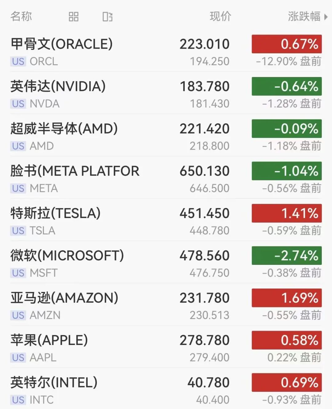 SFC | 名称 日日 li | 现价 | 涨跌幅 ▶ | | --- | --- | --- | | 甲骨文(ORACLE) | 223.010 | 0.67% | | us ORCL | 194.250 | -12.90% 盘前 | | 英伟达(NVIDIA) | 183.780 | -0.64% | | US NVDA | 181.430 | -1.28% 盘前 | | 超威半导体(AMD) | 221.420 | -0.09% | | US AMD | 218.800 | -1.18% 盘前 | | 脸书(META PLATFOR | 650.130 | -1.04% | | US META | 646.500 | -0.56% 盘前 | | 特斯拉(TESLA) | 451.450 | 1.41% | | US TSLA | 448.780 | -0.59% 盘前 | | 微软(MICROSOFT) | 478.560 | -2.74% | | us MSFT | 476.750 | -0.38% 盘前 | | 亚马逊(AMAZON) | 231.780 | 1.69% | | US AMZN | ...