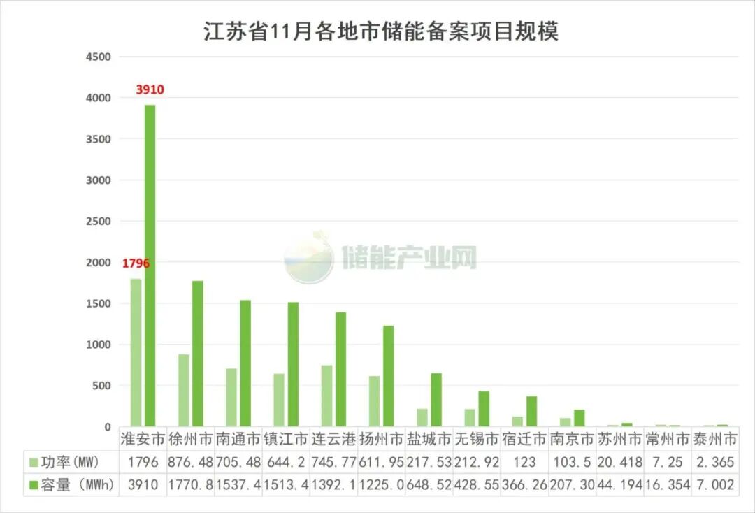(来源:储能产业网) 另从11月储能备案项目充放电时长来看,82%的项目选择2-3小时标准配置方案,远超10月份。此外,其中1-2小时占比6%,3-4小时占比8%,4小时及以上 占比4%。 据储能产业网统计,11月份江苏省储能备案项目共计有180个,总规模超6GW/13GWh(6066.894MW/13067.074MWh)。从备案规模和备案数量来看,11 月份储能备案整体较10月备案有所增加。 从项目类型看,主要分为用户侧、电网侧、光储充等类型,其中用户侧储能项目仍然占比最多。 从各地市分布情况来看,项目规模从几十千瓦时到几百兆瓦时不等,在备案项目规模上,淮安市凭借超1.796GW/3.91GWh的规模位列第一,随后是徐州 市和南通市,依次约为0.88GW/1.77GWh;0.71GW/1.54GWh; 值得注意的是,11月份镇江市、连云港市、扬州市的备案规模均超过1GWh。 在项目数量上,11月份,盐城市居于首位,共计28个备案项目,其次是苏州市26个、南通市23个、徐州市17个。 众所周知,江苏此前分时电价大调整过后,工商业储能项目收益大打折扣,但综合当前备案情况来看,江苏储能项目投资热度仍然在,只是在 ...
