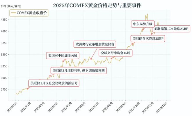 2025年黄金市场行情回顾 - 伦敦现货金价在2025年呈现“阶梯式突破+冲高回调”走势,全年累计涨幅超50%,创1979年以来最强年度表现 [1] - 金价于10月飙升至4380美元/盎司的历史峰值,11月初回调至4000美元下方,截至11月19日又涨破4100美元/盎司 [1] - 一季度金价从2800美元/盎司起步,3月末收于3420美元/盎司,单季度涨幅达22.1%,创2016年二季度以来最佳表现 [1] - 二季度金价在3400-3600美元区间震荡整理,全球黄金ETF持仓增加187吨 [2] - 三季度全球黄金需求总量达1313吨,需求总金额达1460亿美元,双双创下单季度历史最高纪录,金价单季度涨幅扩大至16.9% [2] - 四季度金价冲高回落,10月创历史峰值后,11月初回调至3968美元附近 [2] 金价上涨核心驱动因素 - 地缘政治风险是首要推动因素,黄金作为避险资产,其走势与2022年俄乌冲突、2023年10月中东局势等风险高度一致 [3] - 全球央行持续购金构成最稳固的底部支撑,三季度全球央行净购金220吨,前三季度净购金634吨 [4] - 私人部门投资需求爆发成为金价突破核心推力,三季度全球黄金投资需求达537吨,同比增47%,占当季总需求55% [5] - 美联储政策转向构成核心驱动力,10月底宣布降息25基点,市场预期12月再降25基点,全年累计降息75基点 [6] - 全球债务与通胀为黄金提供长期价值支撑,美国联邦政府债务破35万亿美元,财政赤字占GDP超6% [6] - 2025年四季度拉美对峙、中东危机升级等地缘风险激活避险需求,10月中东局势升级时,COMEX黄金期货单周涨8.3% [6] 央行购金趋势分析 - IMF统计显示,2025年二季度全球外汇储备中黄金占比已较10年前上升8.4个百分点,而美元储备占比降至55%的15年新低 [4] - 世界黄金协会调查显示,43%的受访央行计划未来12个月增持黄金,非美国家黄金储备总价值已接近其持有的美债规模 [5] - 此轮购金潮源于对美元信用体系的担忧,美国财政赤字与贸易政策不确定性推动各国央行加速储备资产重构 [4] - 波兰央行宣布年内将黄金储备从334吨提升至400吨,塞尔维亚央行也计划增持20吨黄金以降低对美元资产的依赖 [4] 投资需求结构变化 - 私人部门投资需求呈现“ETF领涨、实物跟进”特征,三季度实物黄金ETF单季持仓增222吨,前三季度累计增持619吨 [5] - 全球金条与金币需求总量达到316吨,同比增长17%,印度和中国是核心贡献者,需求总量分别为92吨和74吨 [5] - 世界黄金协会称,四季度金饰消费或季节性改善,金价回调与政策刺激有望激活需求,形成二次支撑 [5] 2026年贵金属市场展望 - 业内人士预判2026年将呈现“高位震荡、长期向好”格局,技术面显示3835-3878美元区间形成强支撑 [7] - 世界黄金协会预测2026年一季度金价可能突破4500美元/盎司,甚至达到4800美元/盎司 [7] - 高盛分析师表示,根据各国央行的购金速度,到2026年底,黄金价格将涨至4900美元 [7] - 美元走弱、降息预期与滞胀风险将持续支撑需求,配置价值稳固 [7] - 风险则来自美联储降息不及预期与美元阶段性走强,但全球央行购金与债务压力将限制回调深度 [7] 其他贵金属投资机会 - 白银2025年涨约61%至47.14美元/盎司,机构预计2026年银价将升至59.10美元/盎司,涨幅或达25% [8] - 铂金2025年涨幅超93%至1591美元/盎司,30%机构预期未来一年将升至1815.50美元/盎司,上涨空间约14% [8] - 铜价2025年涨23%至1.1万美元/吨,短期或因投机情绪高位与边际供应复产回调,但2026年均价或维持1万美元/吨以上 [8] - 2026年贵金属市场将从“黄金独大”转向“多元均衡”,建议增配白银、铂金以获超额收益 [8] 资产配置策略建议 - 摩根士丹利首席投资官提出“60/20/20”的资产配置模型,即60%配置于股票,20%配置于债券,20%配置于黄金 [8] - 长期投资者可维持黄金核心配置,短期交易者需密切关注美联储政策会议、地缘局势与美元指数走势 [8] - 业内人士建议用期权工具对冲波动风险,贵金属“防御+进攻”双重属性使其成资产配置核心 [8]