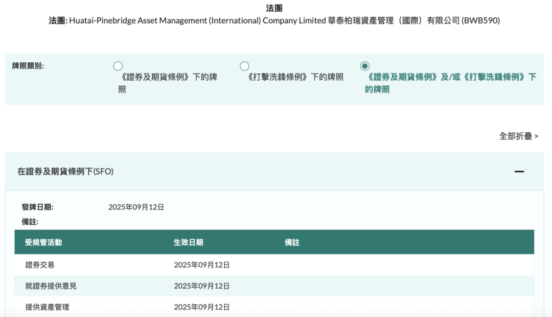 【 导读 】 华泰柏瑞 基金 香港子公司获香港证监会核发牌照 中国基金报记者 储是 华泰柏瑞 基金 香港子公司 华泰柏瑞资管 获批 香港证监会 1号、4号和9号牌照 。 华泰柏瑞资管 获批1号、4号和9号牌照 香港证监会官网显示, 华泰柏瑞基金香港子公司华泰柏瑞资产管理 ( 国际 ) 有限公司 近日 获得香港证监会 ( SFC ) 核发的1号 ( 证券交易 ) 、4号 ( 就证券提供意见 ) 及9号 ( 提供资产管理 ) 牌照。 华泰柏瑞基金现任副总经理柳军及前任副总经理田汉卿为香港子 公司 持牌负责人。 2024年末 ,证监会网站发布的批复文件显示,11月29日,证监会核准华泰柏瑞基金以自有资金在香港特别行政区设立华泰柏瑞资产管理 (国际)有限 公司。公司于2025年 1月成立,注册资本 为 1亿港元 。 2023年 10月, 在 递交境外设立、收购、参股经营机构审批申请 时, 华泰柏瑞基金 表示 香港子公司设立后,将主要考虑两类产品:一 是为中国投资人提供全球资产配置的工具;二是为海外投资人提供投资中国资本市场的配置工具。具体的产品会根据市场情况和投资人需 求择机推出。 公募积极"出海" 近 年来 ,公募 ...