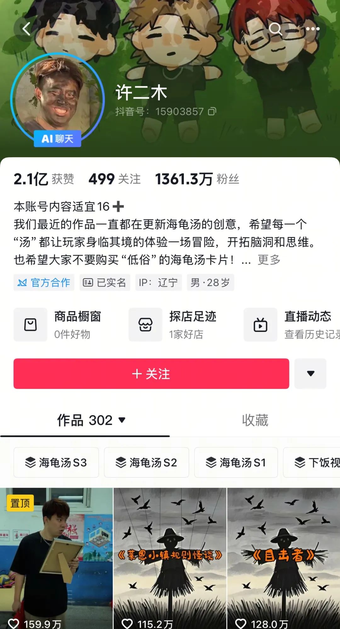 "一个男人走进酒吧,点了一杯水,酒保却突然冲他大吼了一句。男人说了声'谢谢',转身离开。—— 这是为什么?" 如果你正在思考这个问题,那你已经进入了"海龟汤"的世界。海龟汤,一种情境猜谜游戏,玩法是在"脑洞设定"中通过提问一步步还原事件真相。就像刚 才的例子,答案其实是 "酒保吼男人是为了帮他止住打嗝"。 就是这样一个新鲜小众的内容类型,却成就了现象级的黑马创作者@许二木。 2024年10月,许二木发布了第一条"海龟汤"视频。在此之前,他主要发布搞笑剧情类内容,已有百万粉丝基础。但这次内容转型,让他在9个月内涨粉746 万,当前粉丝量达到1361.3万,账号下海龟汤内容播放量超过17亿。同时平台内出现大量用户二创短视频,还有用户自发制作同人漫画、角色图鉴、衍生 玩法。@许二木的"海龟汤宇宙"几乎成为抖音平台内最受欢迎的"精神游乐场"。 第一代内容:可复制的符号公式 在短视频步入用户视野的初期,爆款内容的密码是"可复制、易模仿、快节奏"。比如代古拉K、七舅脑爷、办公室小野,他们的成功,取决于极致复现平 台流行的"娱乐符号",比如手势舞、对嘴型、搞笑人设等。 这类爆款有一个显著特征:可模仿性极强。创作者不是在进行 ...