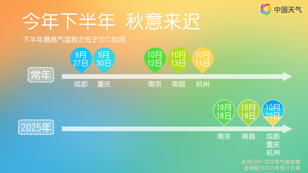 央视网消息:据中国天气网消息,近期,南方多地秋老虎盛行,截至今天,多地气温仍偏高。明天 (10月18日)起,今年下半年来最强冷空气将陆续给南方大部带来显著降温,多地将收到迟迟未至的秋 意。 前段时间,南方多地秋老虎盛行,气温持续偏高。西南地区东部、江南、华南北部等地,过去10天平均 气温大幅偏高,部分地区气温偏高幅度超6℃。像常年9月下旬最高气温就会首次低于20℃的成都和重 庆、常年10月上半月最高气温就会低于20℃的南京、南昌、杭州,立秋后截至今天最高气温都尚未降到 过20℃,秋意迟迟未至。 今天,受今年立秋后最强冷空气影响,北方出现大范围降温。监测显示,今天14时,华北、黄淮、东北 等地降温明显,其中内蒙古中部、河北西北部一带降温幅度最大,部分地区较昨天同时次降温12至 18℃,张北等地气温降至零下。 10月20日,西南地区的成都、重庆,江南东部的杭州,也将出现立秋后首个最高气温低于20℃的日子, 对于成都和重庆,这一天较常年同期晚了半月以上。 | | | | | 省份:浙江省 | > 城市: 杭州 | | | --- | --- | --- | --- | --- | --- | --- | | | | ...