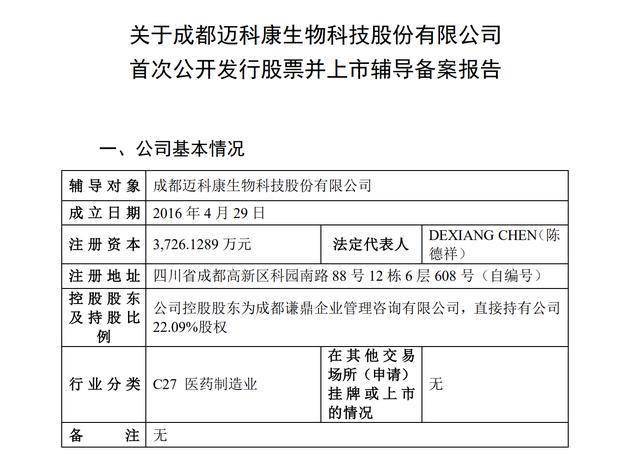 | 辅导对象 | 成都迈科康生物科技股份有限公司 | | | | --- | --- | --- | --- | | 成立日期 | 2016年4月29日 | | | | 注册资本 | 3.726.1289 万元 | 法定代表人 | DEXIANG CHEN ( ) 德祥) | | 注册地址 | 四川省成都高新区科园南路 88号 12 栋 6层 608号(自编号) | | | | 控股股东 及持股比 例 | 公司控股股东为成都谦鼎企业管理咨询有限公司,直接持有公司 22.09%股权 | | | | 行业分类 | C27 医药制造业 无 | 在其他交易 场所(申请) 挂牌或上市 | | | | | 的情况 | | | 注 | 无 | | | 目前,迈科康生物控股股东为成都谦鼎企业管理咨询有限公司,直接持有公司 22.09%股权。 官网显示,迈科康生物董事长,总经理为陈德祥,首席科学家为Mark R. Alderson。 陈德祥,密西西比州立大学免疫学博士,先后在辉瑞(Pfizer)、诺华(Novartis)和帕斯适宜(PATH) 科技组织从事疫苗和疫苗佐剂开发工作超30年,期间主持了多项由国际组织、基金会和国家政 ...