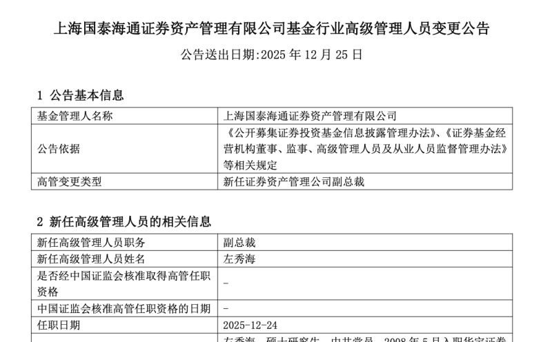 【导读】海通老将左秀海任国泰海通资管副总裁 中国基金报记者 孙越 12 月 25 日,国泰海通资管发布高级管理人员变更公告,宣布聘任左秀海为公司副总裁,任 职日期自 2025 年 12 月 24 日起。公告显示,此次人事调整已通过公司第二届董事会第七 十次会议审议,并将按规定履行备案程序。 | 新任高级管理人员职务 副总裁 | | | --- | --- | | 新任高级管理人员姓名 左秀海 | | | 是否经中国证监会核准取得高管任职 | | | 资格 | | | 中国证监会核准高管任职资格的日期 | | | 任职日期 | 2025-12-24 | | | 十天皇 [] [ ] [ ] ] [ ] ] [ ] [ ] ] [ ] ] [ ] ] [ ] ] [ ] ] [ ] ] ] [ ] ] ] [ ] ] ] [ ] ] ] [ ] ] ] [ ] ] ] [ ] ] ] [ ] ] ] [ ] ] ] [ ] ] ] [ ] ] ] [ ] ] ] [ ] ] [ ] ] [ ] ] ] [ | 左秀海拥有 17 年证券从业经验。公开资料显示,左秀海 2008 年 5 月入职华宝证券有限责 任公司担 ...