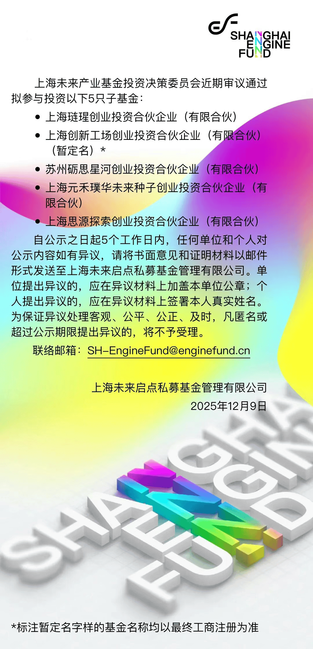 投资界12月9日消息,上海未来产业基金发布公告,投资决策委员会近期审议通过拟参与投资以下5只子基金: - 上海琏瑆创业投资合伙企业(有限合伙) 上海未来产业基金的100亿元由上海市财政全额出资,定位于搭建推动颠覆式创新、多学科交叉创新、前沿平台性技术方向孵化和早期投资的开放赋能平 台,关注科学属性强、转化风险大、现有产业化条件缺乏,但迭代迅速、有机会产生巨大变革的技术。 - 上海创新工场创业投资合伙企业(有限合伙)(暂定名) - 苏州砺思星河创业投资合伙企业(有限合伙) - 上海元禾璞华未来种子创业投资合伙企业(有限合伙) - 上海思源探索创业投资合伙企业(有限合伙) 来源:上海未来产业基金 作为上海市政府设立的投资母基金,上海未来产业基金将坚持"投早投小、投硬科技"战略,成为联合社会资本共同投资、孵化前沿科技的耐心资本和战略 资本。 ...