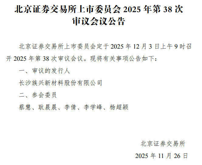 公司上市进程 - 北京证券交易所上市委员会定于2025年12月18日上午9时召开2025年第44次审议会议,审议无锡创达新材料股份有限公司的上市申请 [1] - 公司简称“创达新材” [1] 公司融资与资本开支计划 - 公司拟募集资金30,000.00万元 [1] - 募集资金将分别用于年产12000吨半导体封装用关键配套材料生产线建设项目、研发中心建设项目、补充流动资金 [1] 公司业务与股权结构 - 公司主营业务为高性能热固性复合材料的研发、生产和销售 [1] - 公司控股股东是张俊、锡新投资、陆南平、绵阳惠力 [1] - 公司实际控制人是张俊、陆南平 [1] 上市中介机构 - 公司保荐机构是申万宏源证券承销保荐有限责任公司 [1] - 保荐代表人是康杰、周毅 [1]