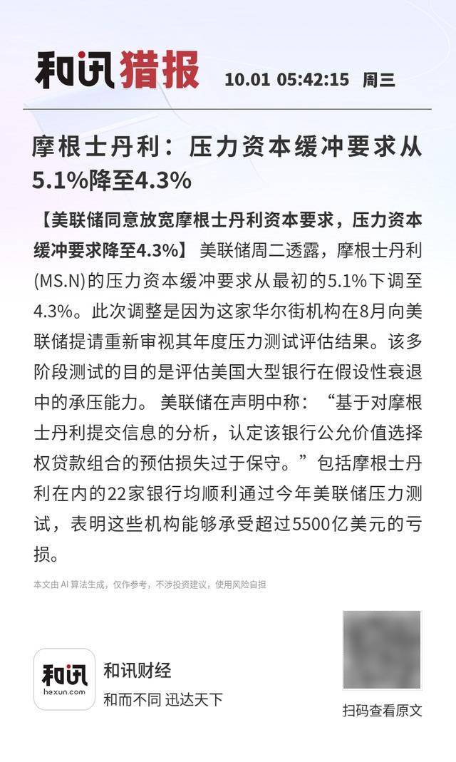 【美联储同意放宽摩根士丹利资本要求,压力资本缓冲要求降至4.3%】美联储周二透露,摩根士丹利 (MS.N)的压力资本缓冲要求从最初的5.1%下调至4.3%。此次调整是因为这家华尔街机构在8月向美联储 提请重新审视其年度压力测试评估结果。该多阶段测试的目的是评估美国大型银行在假设性衰退中的承 压能力。 美联储在声明中称:"基于对摩根士丹利提交信息的分析,认定该银行公允价值选择权贷款组 合的预估损失过于保守。"包括摩根士丹利在内的22家银行均顺利通过今年美联储压力测试,表明这些 机构能够承受超过5500亿美元的亏损。 本文由 AI算法生成,仅作参考,不涉投资建议,使用风险自担 FOG hexun.com 和讯财经 和而不同 迅达天下 扫码查看原文 ...