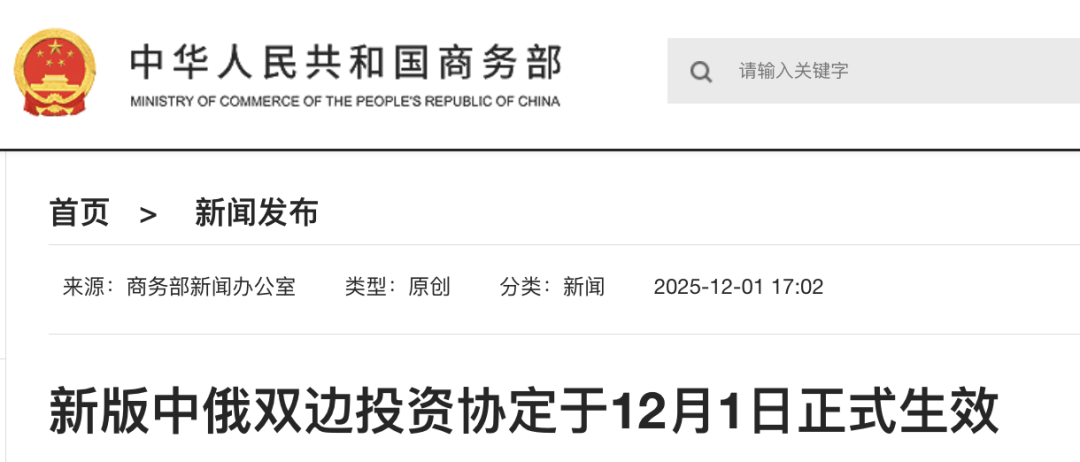 协定生效与背景 - 新版《中华人民共和国政府和俄罗斯联邦政府关于促进和相互保护投资的协定》于12月1日正式生效实施 [1] - 中俄两国政府于2006年签署了初始的双边投资协定 [1] - 双方为营造更加稳定、公平、透明、可预期的营商环境,于2022年启动协定升级谈判 [1] 协定升级进程 - 新版双边投资协定于2025年5月8日签署 [1] - 协定升级旨在为两国投资者及其投资提供更优的营商环境 [1]