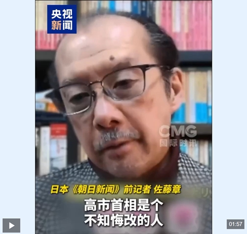佐藤章表示,中国作为与日本相邻的超级大国,对日本经济与社会稳定至关重要,而高市首相是个不知 悔改的人,当前日本国内所谓"摆脱对中国依赖"的论调"荒谬至极",若不能与中国友好相处,日本经济 和社会将难以维系,甚至可能因稀土等关键资源进口受阻而"陷入地狱般的境地"。佐藤章认为,高市应 立即就涉台错误言论公开道歉并撤回声明,否则就只能辞去首相职务,"除此之外别无他法"。 近期,日本首相高市早苗涉台错误言论在日本国内引起强烈不满。日本《朝日新闻》前记者佐藤章12月 16日表示,台湾问题属于中国内政,日本若对中国采取无端的先发制人攻击,根本是"无理取闹"。 ...