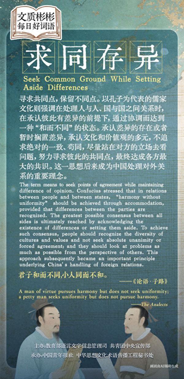 君子和而不同小人同而不和。 《读语 · 于路》 Seek Common Ground While Setting Aside Differences 寻求共同点,保留不同点。以孔子为代表的儒家 文化则强调在处理人与人、国与国之间关系时, 在承认彼此有差异的前提下,通过协调而达到 种"和而不同"的状态。承认差异的存在或者 暂时搁置差异,承认文化和价值观的多元,不追 求绝对的一致、苟同,尽量站在对方的立场去看 同题,努力寻求彼此的共同点,最终达成各方最 大的共识。这一思想后来成为中国处理对外关 系的重要理念。 The term means to seek points of agreement while maintaining difference of opinion. Confucius stressed that in relations between people and between states, "harmony without uniformity" should be achieved through accommodation, provided that differences bet ...