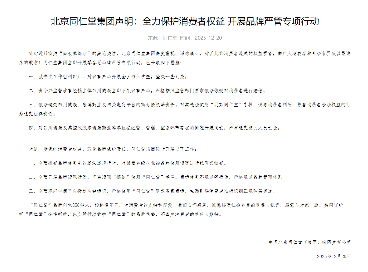来源 | 北京同仁堂官微 中国北京同仁堂(集团)有限责任公司12月20日发布声明: 针对近日有关"南极磷虾油"的舆论关注,北京同仁堂集团高度重视、深感痛心,对因此给消费者造成的 权益损害,向广大消费者和社会各界致以最诚恳的歉意!同仁堂集团立即开展零容忍品牌严管专项行 动,已采取如下措施: 一、派专项工作组到四川,对涉事产品开展全面深入核查,坚决一查到底。 四、对四川健康及其控股股东健康药业等单位在经营、管理、监督环节存在的问题开展问责,严肃追究 相关人员责任。 为进一步保护消费者权益,强化品牌保护责任,同仁堂集团同时开展以下工作: 一、全面排查品牌使用中的违法违规行为,对集团各级企业的品牌使用情况进行拉网式核查。 二、全面开展品牌清理行动,坚决清理"擦边"使用"同仁堂"字号、商标使用不规范等行为,严格规范品 牌管理体系。 三、全面规范电商平台授权店铺标识,严格使用"同仁堂"双龙图案商标,主动引导消费者准确识别正规 购买渠道。 "同仁堂"品牌创立356年来,始终离不开广大消费者的支持和厚爱。我们心怀感恩,诚恳接受社会各界 的监督与批评,愿意与大家一道,共同守护好"同仁堂"金字招牌,以实际行动维护"同仁堂"的品牌 ...