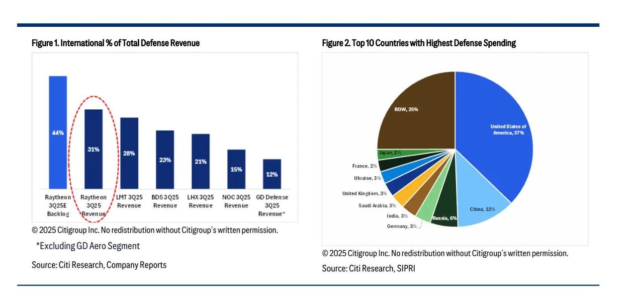 智通财经APP获悉,华尔街金融巨头花旗近日发布研报称,"国际再武装"趋势(International Rearmament)即将成为结构性且横跨多年的全球军工国防需求主 线,并且预言国际股票市场军工板块将在未来2-3年持续位列全球股市热门投资板块,有望成为推动股市上涨的核心贡献力量,而来自美国的军工巨头雷神 技术公司(RTX.US)因其相比于洛马等同行显著更高的国际业务营收/订单敞口,势必将成为花旗强调的板块核心受益标的之一。 在一个充满着贸易摩擦、地缘政治动荡与冲突以及隐约的"人工智能泡沫破裂"担忧情绪的年份中,国防军工板块以及包括黄金、白银与铂金在内的贵金属交 易价格在2025年可谓全面跃升,而除黄金外的"传统避险资产"集体失灵,这是资本市场百年历史中前所未有的极端定价局面。 如果你担心全球地缘政治冲突日益剧烈,把钱投向传统的防御性质股市板块(比如公用事业与必需消费品这一最典型的"传统安全避风港")并不是最佳选择, 真正的好去处反而是有着"另类避风港"称号的国防军工板块这一和地缘政治密切相关的本身板块。最新统计数据显示,国防军工投资狂潮可谓席卷股票市 场,比如美国航空航天与国防类股票在2025年迄今录得高 ...