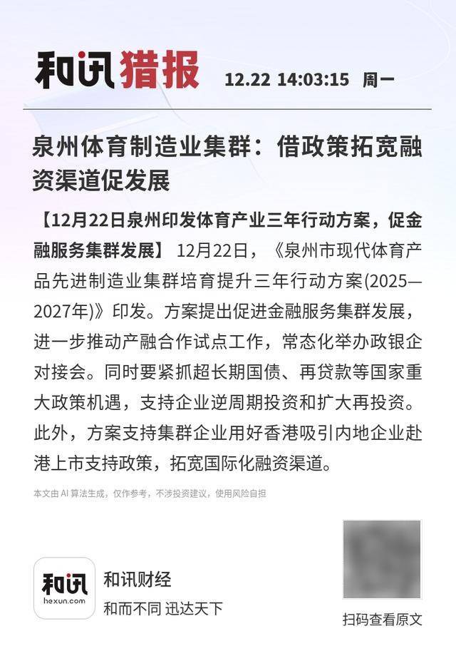 【12月22日泉州印发体育产业三年行动方案,促金融服务集群发展】12月22日,《泉州市现代体育产品 先进制造业集群培育提升三年行动方案(2025—2027年)》印发。方案提出促进金融服务集群发展,进一 步推动产融合作试点工作,常态化举办政银企对接会。同时要紧抓超长期国债、再贷款等国家重大政策 机遇,支持企业逆周期投资和扩大再投资。 此外,方案支持集群企业用好香港吸引内地企业赴港上市 支持政策,拓宽国际化融资渠道。 本文由 AI算法生成,仅作参考,不涉投资建议,使用风险自担 和讯猎报 12.22 14:03:15 周- 和讯财经 和而不同 迅达天下 扫码查看原文 泉州体育制造业集群:借政策拓宽融 资渠道促发展 【12月22日泉州印发体育产业三年行动方案,促金 融服务集群发展】12月22日,《泉州市现代体育产 品先进制造业集群培育提升三年行动方案(2025- 2027年)》印发。方案提出促进金融服务集群发展, 进一步推动产融合作试点工作,常态化举办政银企 对接会。同时要紧抓超长期国债、再贷款等国家重 大政策机遇,支持企业逆周期投资和扩大再投资。 此外,方案支持集群企业用好香港吸引内地企业赴 港上市支持政策,拓宽国 ...