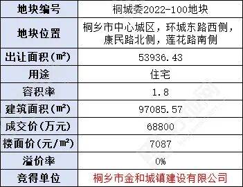 金和城建以底价6.88亿竞得嘉兴桐乡市中心城区宅地,楼面价7087元/㎡