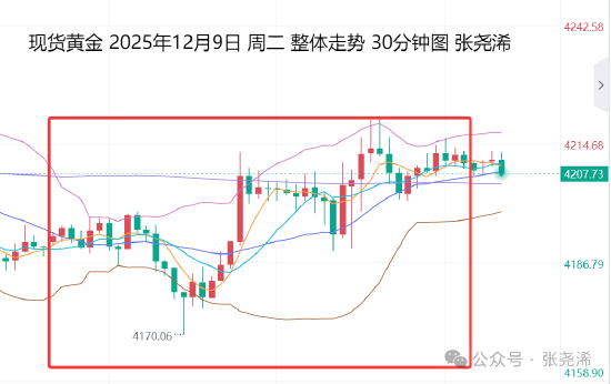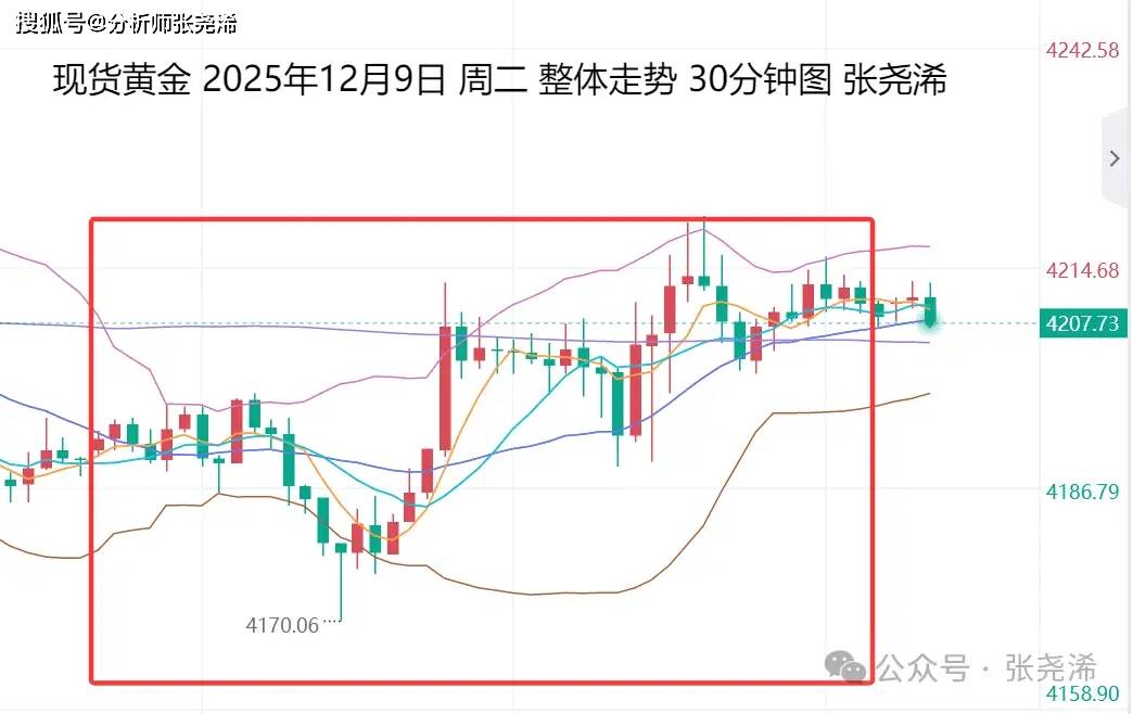 张尧浠:美联储决议来袭、金价维持震荡等待方向指引 上交易日周二(12月9日):国际黄金如期震荡收涨,维持近日的震荡格局走盘,同时仍处于布林带中轨上方,暗示后市仍有再度走强攀升的预期,但也需 突破目前的趋势线阻力压制,否则将仍有回落调整的风险。 具体走势上,金价自亚市开于4190.42美元/盎司,先行走低,于亚盘尾时段录得日内低点4170.19美元,之后触底回升,并维持在日内开盘价上方震荡偏 强,且于美盘时段录得日内高点4221.09美元,最终有所遇阻回撤,收于4208.07美元,日振幅50.9美元,收涨17.65美元,涨幅0.42%。 影响上,虽然特朗普表示可能降低部分价格过高的商品关税,以及美国就业市场等数据好于预期,推动美元走强,打压金价;但由于震荡买盘支撑,以及 交易员对美联储降息保持乐观,认为美联储在未来会议中仍有降息空间,从而限制了美元的上涨动力,对黄金形成一定支撑。同时地缘局势的不确定性也 令避险需求持续存在,为金价提供底部支撑,推动其反弹收涨。 展望今日周三(12月10日):国际黄金开盘先行偏强运行,受到昨日反弹收涨于短期均线上方的买盘支撑,以及早间美元指数先行走弱的提振,但由于市场 等待美联储 ...