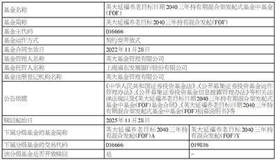 基金基本信息 - 基金全称为美大处福作老目标目爵2040年持有隔配合型发起式基金中基金(FOF),基金简称为美大运福养老目标2040年特有限含发起(FOF)[1] - 基金合同生效日为2022年11月28日,基金运作方式为契约型开放式[1] - 基金管理人为美大基金管理有限公司,基金托管人为再浦东发展银行股份有限公司[1] - 基金A类份额交易代码为019810,Y类份额交易代码为016000[1] 赎回业务开放安排 - A类基金份额于2025年11月28日起开放办理赎回业务[2] - Y类基金份额开放赎回业务将另行公告[2][9] - 赎回办理时间为上海证券交易所、深圳证券交易所正常交易日的交易时间[3] 赎回规则与限制 - 在目标日期2040年12月31日前,每笔份额最短持有期为3年,满足持有期后方可赎回且不收取赎回费用[4][6] - 单笔赎回不得少于1份,若账户份额余额不足1份则必须一次性赎回全部份额[5] - 基金暂不开通转换业务,若后续开通将另行公告[9] 销售与信息披露 - 直销机构为英大基金管理有限公司,注册资本为11.46亿元人民币[6] - 场外非直销机构情况详见相关公告及管理人网站[7] - 基金份额净值通过规定网站、销售机构网站或营业网点披露[8]