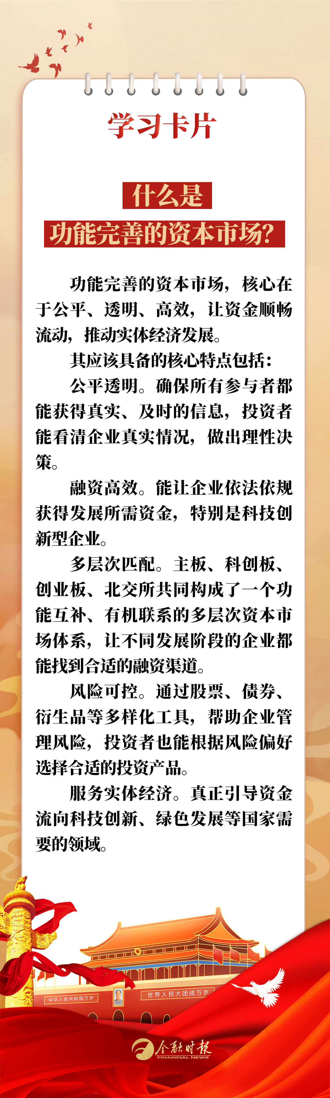 " * * " 0 学习卡片 什么是 功能完善的资本市场? 功能完善的资本市场,核心在 于公平、透明、高效,让资金顺畅 流动,推动实体经济发展。 其应该具备的核心特点包括: 强化监管,保护投资者权益。 构建"长牙带刺"监管体系,严厉 打击违规减持、操纵市场、内幕交 易等行为。完善信息披露制度。强 化上市公司现金分红,引导企业提 升投资价值。 公平透明。确保所有参与者都 能获得真实、及时的信息,投资者 能看清企业真实情况,做出理性决 策。 融资高效。能让企业依法依规 获得发展所需资金,特别是科技创 新型企业。 多层次匹配。主板、科创板、 创业板、北交所共同构成了一个功 能互补、有机联系的多层次资本市 场体系,让不同发展阶段的企业都 能找到合适的融资渠道。 风险可控。通过股票、债券、 衍生品等多样化工具,帮助企业管 理风险,投资者也能根据风险偏好 选择合适的投资产品。 服务实体经济。真正引导资金 流向科技创新、绿色发展等国家需 要的领域。 l l l l l l l l l l 学习卡片 如何建立健全 功能完善的资本市场? 夯实基础制度。严把"入 口",压实中介机构"看门人"责 任 ル) 源头上提升上市公司质量。 ...