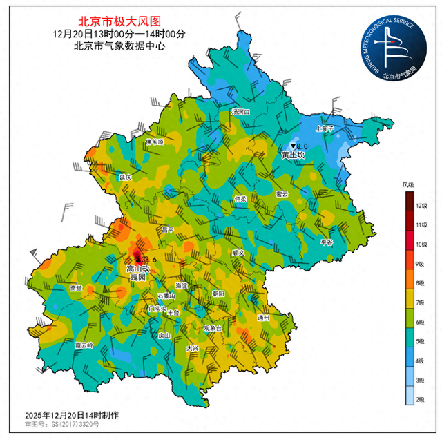 气温实况 转自:北京日报客户端 天气跟踪 | 12月20日14时大风和气温实况 大风实况 14时前后,我市风力较大,大部地区阵风6、7级,局地阵风8级以上。 截至14时,风速极大值出现在门头沟高山玫瑰园,35.2米/秒(12级);平原地区风速极大值在海淀车 耳营,23.1米/秒(9级)。 北京市气象台20日14时发布:今天下午晴间多云,偏北风三四级(阵风六七级),最高气温4℃;夜间 晴,偏北风二三级,最低气温-9℃。 大风蓝色预警中,白天北风较大,风寒效应显著,注意防风防寒和用火用电安全,傍晚到入夜前后风力 减弱。 北京市发布 x 蓝色预警 公众防护指引 GALE 加强户外活动的安全管理,暂停举办有组 织的登山、徒步、骑行等户外运动。 加强室外动火引发火灾事故的防范。 注意出行安全,车辆、人员避免在高大建 筑物、广告牌、临时搭建物或大树的下方 停留。 北京市突发事件应急委员会办公室 北京市应急管理局 (图片来源:中国气象局) 来源:气象北京 20日14时,南郊观象台气温3.6℃(昨日同时次9.6℃),相对湿度13%,目前本市城区气温2~4℃。 天气预报 ...