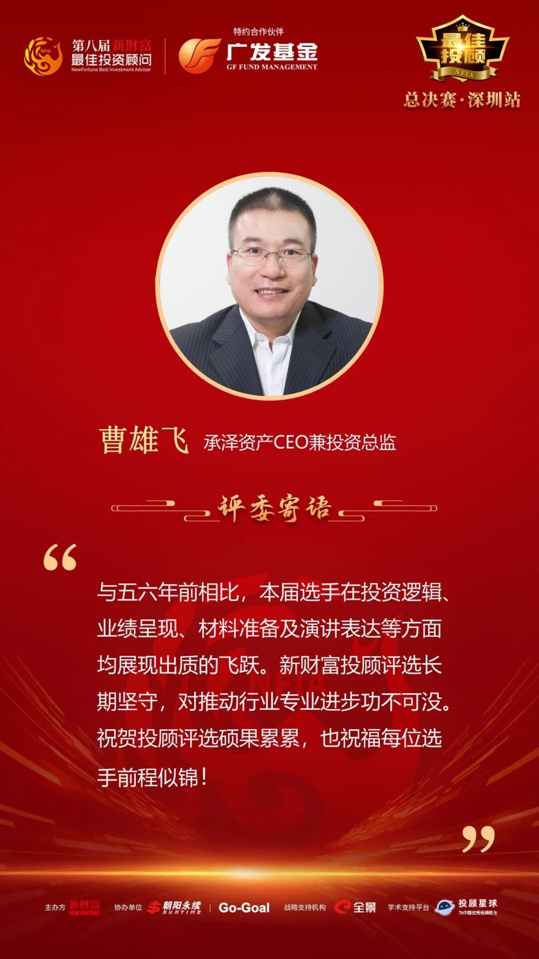 历经数月的激烈角逐, "第八届新财富最佳投资顾问"评选结果 于昨日揭晓。在聚焦"服务能力"的总决赛阶段,新财富于成都、北京、深圳、上海四地 搭建舞台,由54位来自券商、公私募及三方机构的资深评委坐镇,通过严谨的现场评审与答辩,最终从众多精英中遴选出91位行业标杆。他们不仅展现 了卓越的个人专业素养,更树立了财富管理行业以客户为中心的服务典范。 一场高规格的赛事,也是一次行业思想的深度碰撞。我们特邀本届评委留下寄语,他们以深刻的洞察与殷切的期盼,共同勾勒出财富管理行业的当下风 貌与未来图景。 部分评委寄语(排名不分先后,以机构首字母为序) 承泽资产CEO兼投资总监曹雄飞 : 与五六年前相比,本届选手在投资逻辑、业绩呈现、材料准备及演讲表达等方面均展现出质的飞跃。新财富投顾评 选长期坚守,对推动行业专业进步功不可没。祝贺评选硕果累累,也祝福每位选手前程似锦! 绰瑞基金基金经理金戈 : 作为第一次参加的评委,我从自己的专业角度对各位参评者给出分析和建议,同时也了解到券商服务的新生态。每个参评者 表现都非常出色,不仅要做专业投资方面的建议,同时也负责给不同经历不同背景的客户来做资产配置。希望新财富最佳投顾评选越来越好 ...