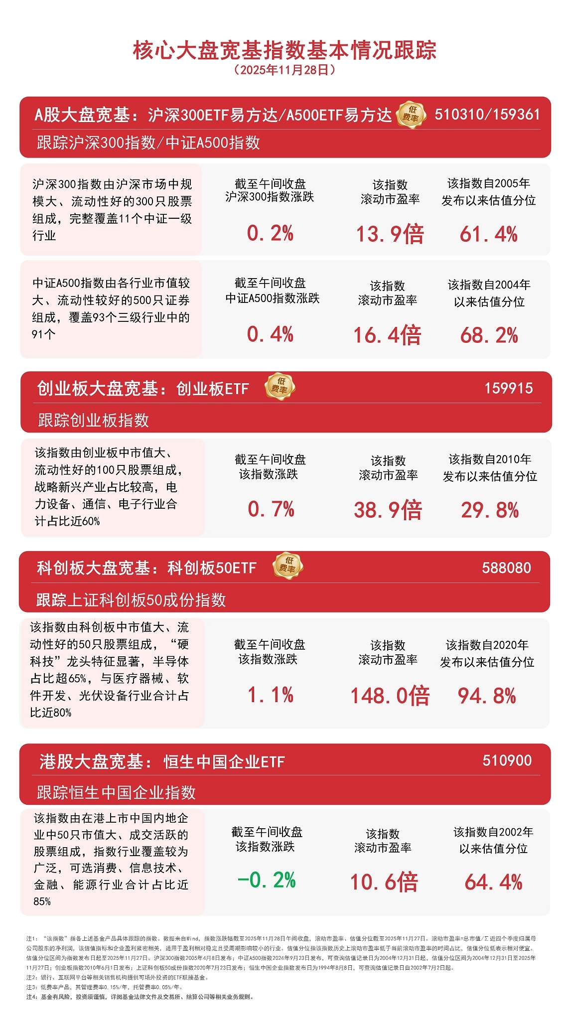 市场整体表现 - A股三大指数低开高走,全市场超3500家个股上涨[1] - 截至午间收盘,中证A500指数上涨0.4%,沪深300指数上涨0.2%,创业板指数上涨0.7%,上证科创板50成份指数上涨1.1%[1] - 港股恒生中国企业指数下跌0.2%[1] 板块表现 - 乳业、能源金属、半导体等板块表现活跃[1] - 医药、游戏、银行等板块出现调整[1] - 港股市场中医药股跌幅居前[1] 主要指数估值与特征 - 沪深300指数滚动市盈率为13.9倍,自2005年发布以来估值分位数为61.4%[3] - 中证A500指数滚动市盈率为16.4倍,自2004年以来估值分位数为68.2%[3] - 创业板指数滚动市盈率为38.9倍,自2010年发布以来估值分位数为29.8%,电力设备、通信、电子行业合计占比近60%[3] - 上证科创板50成份指数滚动市盈率为148.0倍,自2020年发布以来估值分位数为94.8%,半导体占比超65%,与医疗器械、软件开发、光伏设备行业合计占比近80%[3] - 恒生中国企业指数滚动市盈率为10.6倍,自2002年以来估值分位数为64.4%,可选消费、信息技术、金融、能源行业合计占比近85%[4]
