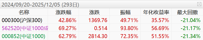 2024年"924"行情开始,A股市场小盘风格显著跑赢大盘风格,从区间表现来看,2024年9月20日至今,中证1000成长ETF(562520)累计上涨69.27%,同期 跑赢沪深300指数26个百分点,同时也跑赢中证1000指数6个百分点。 | 2024/09/20-2025/12/05 (293日) | | | | | × | | --- | --- | --- | --- | --- | --- | | 名称 | 涨跌幅 | 涨跌 | 振幅 | 年化收益率 | 最大回撤 | | 000300(沪深300) | 42.86% | 1369.76 | 49.71% | 35.57% | -21.04% | | 562520(中证1000成 | 69.27% | 0.514 | 93.80% | 56.69% | -21.17% | | 000852(中证1000) | 62.79% | 2814.30 | 72.35% | 51.55% | -21.34% | 从历史表现来看中证1000成长所跟踪的指数已经连续20年跑赢中证1000指数。进攻、回撤均有不俗表现。 | 年份 | 中证1000成长指数 | 中证 ...