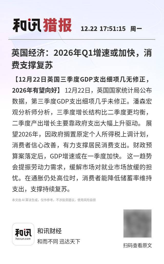 【12月22日英国三季度GDP支出细项几无修正,2026年有望向好】12月22日,英国国家统计局公布数 据,第三季度GDP支出细项几乎未修正。潘森宏观分析师分析,三季度增长结构比二季度更均衡,二季 度产出增长主要靠政府支出大幅上升驱动。 展望2026年,因政府搁置原定个人所得税上调计划,消费 者信心改善,有力支撑居民消费支出。财政预算案落定后,GDP增速或在一季度加快。 这一趋势会提 振劳动力需求,缓解市场对就业市场放缓的担忧。在通胀仍处高位时,消费者能降低储蓄率维持支出, 支撑持续复苏。 和讯财经 和而不同 迅达天下 本文由 AI算法生成,仅作参考,不涉投资建议,使用风险自担 和讯猎报 12.22 17:51:15 周一 扫码查看原文 英国经济:2026年Q1增速或加快,消 费专撑复苏 【12月22日英国三季度GDP支出细项几无修正, 2026年有望向好】12月22日,英国国家统计局公布 数据,第三季度GDP支出细项几乎未修正。潘森宏 观分析师分析,三季度增长结构比二季度更均衡, 二季度产出增长主要靠政府支出大幅上升驱动。展 望2026年,因政府搁置原定个人所得税上调计划, 消费者信心改善,有力支撑居民消费 ...