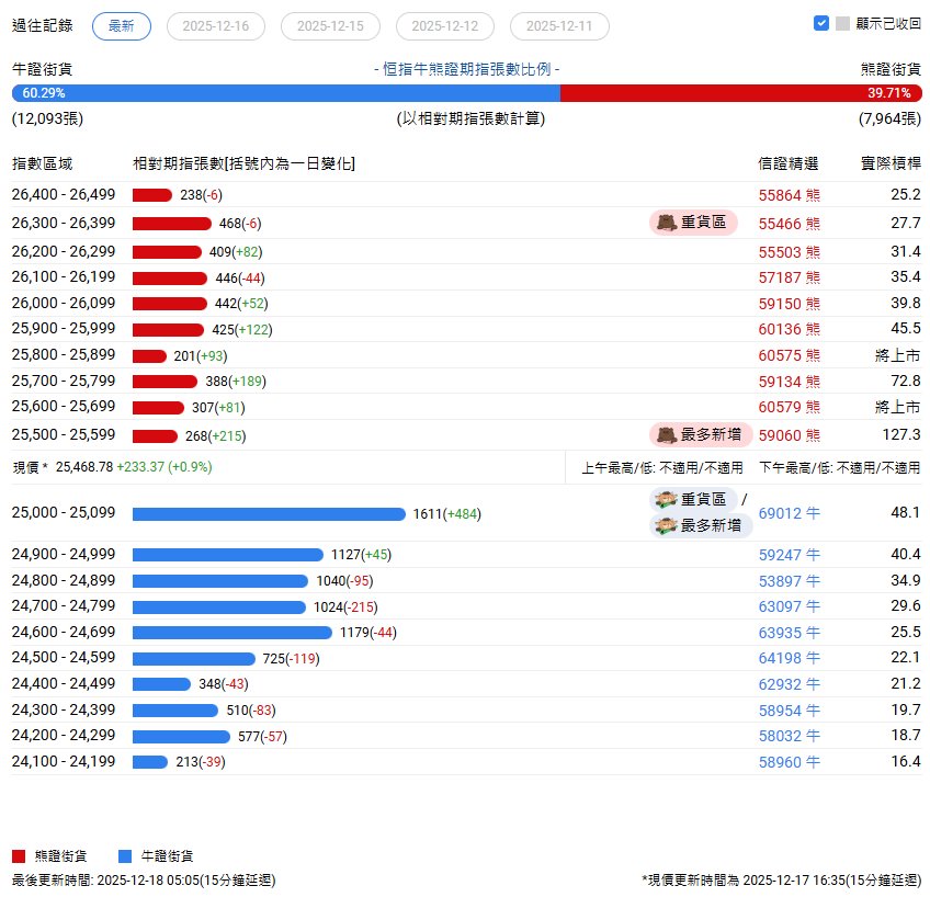 牛证街货重货区及最多新增均在25000 - 25099区间,该区间最新牛证数量为1611张,较上一交易日增加484张。 智通财经APP获悉,截至12月18日,恒指最新的牛熊街货比例为60:40。 中信证券牛熊证街货分布图中的数据显示,熊证街货重货区在26300 - 26399区间,该区间最新熊证数量为468张,较上一 交易日减少6张;熊证街货最多新增在25500 - 25599区间,该区间最新熊证数量为268张,较上一交易日增加215张。 | 過往記錄 | 最新 | 2025-12-16 | 2025-12-15 | 2025-12-12 | 2025-12-11 | | | 顯示已收回 | | --- | --- | --- | --- | --- | --- | --- | --- | --- | | 牛證街貨 | | | | - 恒指牛熊證期指張數比例 - | | | | 熊證街貨 | | 60.29% | | | | | | | | 39.71% | | (12,093張) | | | | (以相對期指張數計算) | | | | (7,964張) | | 指數區域 | | 相對期指張數[括號內為一日變 ...