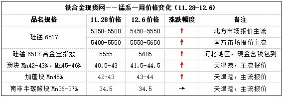 市场格局 - 近期硅锰市场整体呈现成本驱动增强、供需博弈提升、价格震荡观望的格局 [1] - 成本支撑不断强化,但硅锰自身供需结构改善有限 [1] - 短期随着钢招逐步展开,市场难减观望情绪 [1] 价格变动 - 硅锰6517北方市场主流报价从11月28日的5350-5500元/吨上涨至12月6日的5450-5550元/吨 [2] - 硅锰6517南方市场主流报价从11月28日的5400-5550元/吨上涨至12月6日的5550-5650元/吨 [2] - 河北地区硅锰6517合金宝指数从11月28日的2555元/吨大幅上涨至12月6日的5685元/吨 [2] 锰矿原料价格 - 天津港澳块(Mn42-43%、Mn45-46%)主流报价从11月28日的40.5-43元/吨度上涨至12月6日的41.5-44.5元/吨度 [2] - 天津港加蓬块(Mn45%)主流报价从11月28日的42-43元/吨度上涨至12月6日的43-44元/吨度 [2] - 天津港南非半碳酸块(Mn36-37%)主流报价在11月28日至12月6日期间稳定在34.5元/吨度 [2]