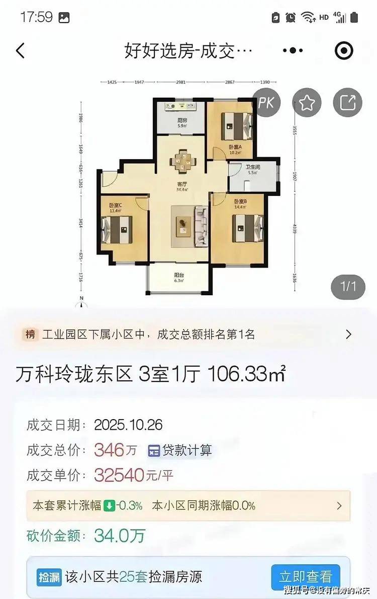 近日,苏州万科玲珑东区一套106平房子355万成交,单价从5.2万跌到3.2万,比2021年高峰整整少了四成。引发网络关 注。 17:59 网 D Q S. HD 4910 好好选房-成交 … 好爸 1/1 榜 工业园区下属小区中,成交总额排名第1名 万科玲珑东区 3室1厅 106.33㎡ 成交日期:2025.10.26 成交总价:346万 园贷款计算 成交单价:32540元/平 本套累计涨幅 +0.3% 本小区同期涨幅0.0% > 砍价金额:34.0万 检漏 该小区共25套捡漏房源 > 立即查看 製』号@没有偏旁的常东 原房东2021年高点560万入手,三年亏掉200万,终于割肉离场。小区地段不错,地铁口步行十分钟,周边学校商场全配 齐,同户型挂牌还有好几套。买家一句话"再降也降不到哪去",卖家一句话"早卖早解脱"市场就这样,买方慢慢挑,卖 方急着跑,房子回归住的功能,投资客被教做人。房价跌回3年前,刚需终于不用抢。咬牙上车的人踏实还贷,割肉离 场的人认栽离场,市场冷暖各自承担。针对此事,有网友评论,独卫就这一点,这个房子就很垃圾,不值这个价格,还 没跌够。有网友直言,那儿的房子不值3w。 值得警示的是,买 ...