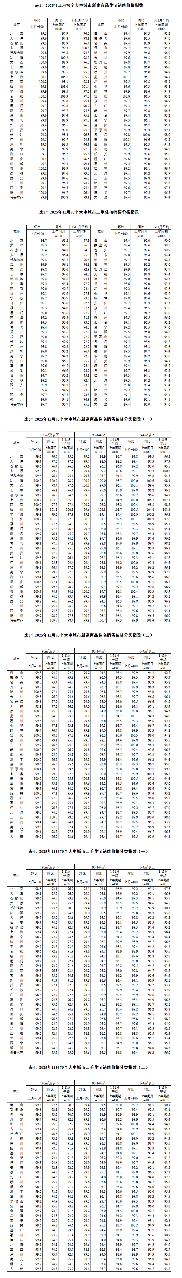 一、一二三线城市商品住宅销售价格环比下降 二、一二三线城市商品住宅销售价格同比降幅扩大 据国家统计局网站15日消息,2025年11月份,70个大中城市商品住宅销售价格环比总体下降、同比降幅 扩大。 11月份,一线城市二手住宅销售价格环比下降1.1%,降幅比上月扩大0.2个百分点。其中,北京、上 海、广州和深圳分别下降1.3%、0.8%、1.2%和1.0%。二线城市二手住宅销售价格环比下降0.6%,降 幅与上月相同。三线城市二手住宅销售价格环比下降0.6%,降幅收窄0.1个百分点。 11月份,一线城市新建商品住宅销售价格环比下降0.4%,降幅比上月扩大0.1个百分点。其中,上海上 涨0.1%,北京、广州和深圳分别下降0.5%、0.5%和0.9%。二、三线城市新建商品住宅销售价格环比分 别下降0.3%和0.4%,降幅均收窄0.1个百分点。 表3: 2025年11月70个大中城市新建商品住宅销售价格分类指数(—) 11月份,一线城市新建商品住宅销售价格同比下降1.2%,降幅比上月扩大0.4个百分点。其中,上海上 涨5.1%,北京、广州和深圳分别下降2.1%、4.3%和3.7%。二、三线城市新建商品住宅销售价格同比分 ...