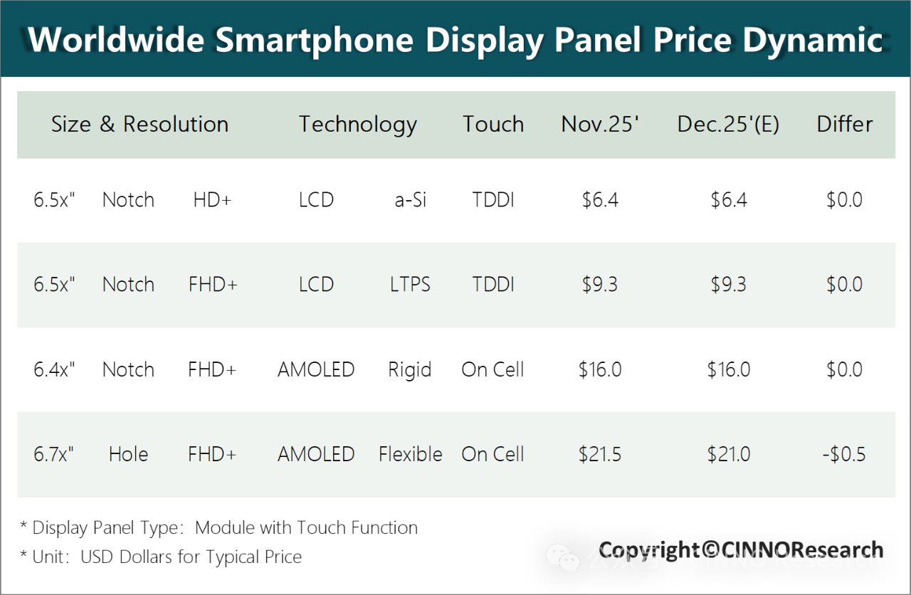 12月18日,CINNO Research发文指出,进入12月,尽管年末促销旺季接近尾声,手机面板市场整体稼动率仍保持在高位,但内部结构性分化趋势愈发显 著。a-Si模组则在低端手机及维修市场的稳定支撑下保持满产,但模组端竞争激烈,价格承压;LTPS产线受益于车载、笔电和平板等非手机应用的强劲需 求,稼动率持续高位运行;柔性AMOLED面板厂则面临稼动率小幅下滑与价格走低的双重压力。 | | Size & Resolution | | Technology | | Touch | Nov.25' | Dec.25'(E) | | --- | --- | --- | --- | --- | --- | --- | --- | | 6.5x" | Notch | HD+ | LCD | a-Si | TDDI | $6.4 | $6.4 | | 6.5x" | Notch | FHD+ | LCD | ГТРЅ | TDDI | $9.3 | $9.3 | | 6.4x" | Notch | FHD+ | AMOLED | Rigid | On Cell | $16.0 | $16.0 | | 6.7x" | H ...