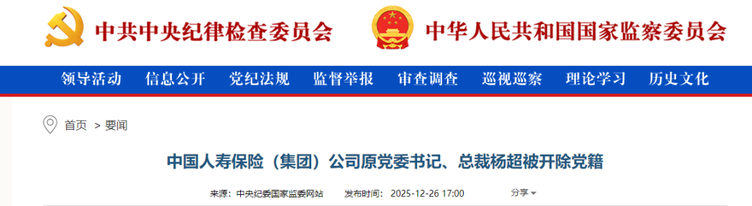 2025.12. 27 本文字数901,阅读时长大约2分钟 作者 | 第一财 经 杜川 据中央纪委国家监委驻中国人寿纪检监察组、江西省纪委监委消息,日前,中央纪委国家监委驻中国人寿纪检监察组、江西省上饶市监委对中国 人寿保险(集团)公司原党委书记、总裁杨超严重违纪违法问题进行了纪律审查和监察调查。 小红书回应被丽江古城喊话 中央纪委国家监委网站显示,杨超严重违反党的政治纪律、组织纪律、廉洁纪律和生活纪律,构成严重职务违法并涉嫌受贿罪、利用影响力受贿 罪,且在党的十八大后不收敛、不收手,性质严重,影响恶劣,应予严肃处理。依据《中国共产党纪律处分条例》《中华人民共和国监察法》 《中华人民共和国公职人员政务处分法》等有关规定,经中国人寿保险(集团)公司党委研究,决定给予杨超开除党籍处分,按规定取消其享受 的待遇;收缴其违纪违法所得;涉嫌犯罪问题由江西省上饶市监委移送检察机关依法审查起诉,所涉财物一并移送。 公开资料显示,杨超生于1950年,现年75岁。曾历任中国人民保险公司董事兼营业部总经理、中国人民保险公司上海浦东分公司总经理、中国 人民保险公司上海分公司副总经理、助理总经理、中国银行上海分行职员。 2005年5 ...