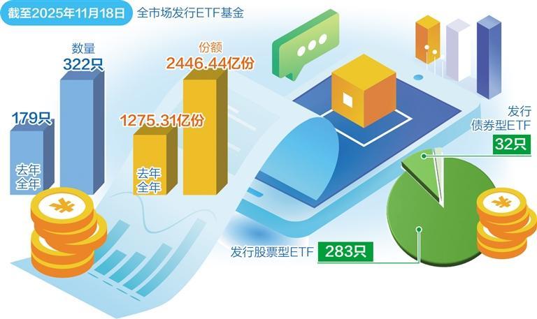 股票型基金成为ETF发行主力。数据显示,今年以来发行股票型ETF达283只,占到发行总量的87.89%,合计 发行份额达1493.95亿份,占到总份额的61.07%。具体来看,其中以被动指数型基金为主,发行数量达265 只,而增强指数型基金仅18只。 紧随其后的是债券型基金。数据显示,今年以来发行32只债券型ETF,占到发行总量的9.94%,合计发行份额 为914.83亿份,占到总份额的37.39%。此外,QDII基金尽管发行数量有限,但市场接受度较高。数据显示, 今年以来虽然仅发行7只QDII基金,合计发行份额仅37.67亿份,但截止日份额达100.52亿份,呈现出明显的 超募现象,反映出投资者对海外市场投资工具的需求较为旺盛。 在政策推动、产品特性、投资者偏好等多方面因素影响下,交易型开放式指数基金(ETF)市场规模不断提 升。截至2025年12月15日,ETF总规模已从年初的约3.73万亿元激增至约5.74万亿元,年内规模增长超2万亿 元,增速超过53%。 ETF市场的发展离不开政策助力,近年来,相关支持政策频出。2024年4月发布的新"国九条"提出,建立交易 型开放式指数基金快速审批通道,推动指数化投 ...