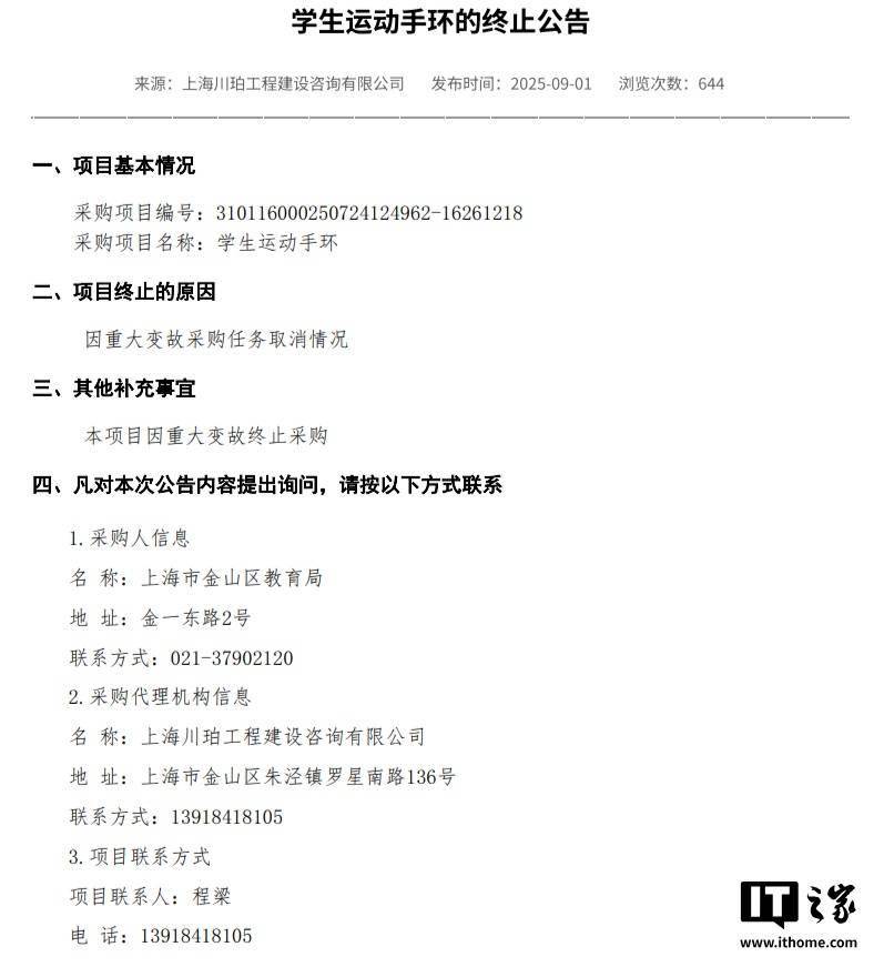 因重大变故,上海金山区教育局400万元采购学生运动手环项目终止