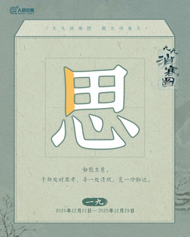 OVEHR # 九 九 消 寒 图 数 九 待 春 天 # 路虽远,行则将至。 向前走,沿途皆风景。 (1) 元) 2026年2月22日一 2026年3月2日 OVEHER # 九 九 消 寒 图 数 九 待 春 天 # 珍惜当下,珍视此刻,珍重所爱。 每一寸光阴都是限量版,用心感受,生活处处可爱。 四九日 2026年1月17日—2026年1月25日 Qyeen # 九十九 消息案 图 | 教育九 特 春 天 # - 相信自己,相信时间。 在不断前行的路上,遇见更好的自己。 五九 2026年1月26日—2026年2月3日 OVEHE # 九 九 消 寒 图 数 九 待 春 天 # 拼搏者,自带光芒。 愿前路光明坦荡,愿四季喜乐长安。 六九 2026年2月4日一2026年2月12日 @VEHR # 九 九 消 寒 图 教 九 待 春 天 # 一岁一除夕,一年一团圆。 福启新岁,和和美美,万事顺遂。 七九 2026年2月13日— 2026年2月21日 今日冬至,"数九寒天"正式开启。在"数九"习俗中,兼具"日志"与"游戏"功能的"九九消寒图",赋予"熬 冬"以雅趣。9个九画汉字,每天按笔画顺序填实一笔,在笔画旁记 ...