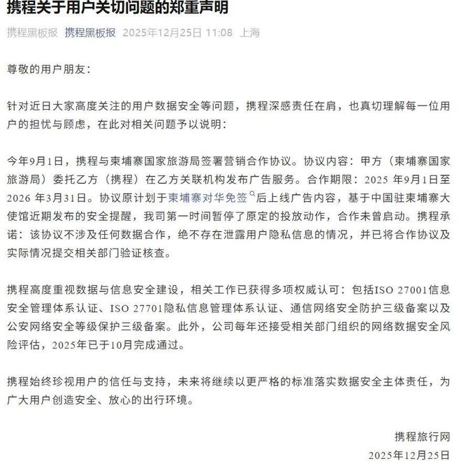 据"携程黑板报"消息,携程发布声明称,针对近日大家高度关注的用户数据安全等问题,在此对相关问 题予以说明: 今年9月1日,携程与柬埔寨国家旅游局签署营销合作协议。协议内容:甲方(柬埔寨国家旅游局)委托 乙方(携程)在乙方关联机构发布广告服务。合作期限:2025 年9月1日至2026 年3月31日。协议原计划 于柬埔寨对华免签后上线广告内容,基于中国驻柬埔寨大使馆近期发布的安全提醒,我司第一时间暂停 了原定的投放动作,合作未曾启动。携程承诺:该协议不涉及任何数据合作,绝不存在泄露用户隐私信 息的情况,并已将合作协议及实际情况提交相关部门验证核查。 携程高度重视数据与信息安全建设,相关工作已获得多项权威认可:包括ISO 27001信息安全管理体系 认证、ISO 27701隐私信息管理体系认证、通信网络安全防护三级备案以及公安网络安全等级保护三级 备案。此外,公司每年还接受相关部门组织的网络数据安全风险评估,2025年已于10月完成通过。 ...