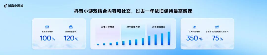 抖音小游戏生态大会已圆满落幕。本次大会作为抖音小游戏行业的年度盛会,汇聚了抖音小游戏平台关键业务负责人、头部游戏开发者、资深行业专家及 产业链上下游代表,参会规模近千人。 从嘉宾规格来看,中国音像与数字出版协会常务副理事长兼秘书长 敖然率先开场致辞,首先肯定了抖音小游戏今年以来的表现及成绩,继而点名了今年 大会的主旨"以"内容驱动社交"的新范式,重塑了小游戏的价值维度与发展路径。 紧接着,抖音社交与互动业务负责人 林克以及巨量引擎直客业务行业与客户运营负责人 黄志发相继分享了抖音小游戏的成绩表现。前者阐述到,"过去一 年,抖音小游戏流水规模增长100%、用户活跃规模增长120%。"后者则分享到,"创作者规模增长,达人生态更加繁荣,其中发行人流水增长220%,总作 者数增长360%。" 具体情况如何?今天,DataEye研究院将从抖音小游戏数据表现、发展趋势以及自我观察三大维度展开深度剖析,解读并探讨其对行业的启示意义。 一、抖音小游戏新数据曝光 (一)抖音小游戏大盘数据:用户活跃、流水规模全面爆发 抖音小游戏生态各项核心数据均呈现爆发式增长态势。其中,流水规模增长100%、日活跃用户(DAU)同比增长120% ...