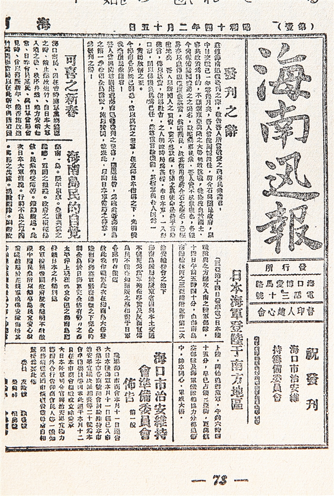 80多年前日寇侵琼,给琼崖人民带来无限伤痛 铁蹄踏琼岛 血泪鉴山河 本版图片除署名外均取自省委党史研究室编撰的《海南抗战图集》。 海南日报全媒体记者 梁君穷 被日军强征的海南劳工,被迫在极端恶劣的环境中劳动。 1941年4月19日,日军将海口市民逮捕后运往郊外屠杀。 昌江石碌铁矿国家矿山公园里的死难矿工纪念碑。(资料图) 1939年,日军在文昌县清澜港进行"扫荡"作战。 1939年4月,在日军入侵中,琼东县(今琼海市)嘉积镇新民街被日军炮火炸成废墟。 时间最直白的力量,是将亲历者带走。那些曾在战场冲锋的战士,那些曾被日寇伤害的亲历者,随着时 间的无情推移,正一个个地离我们远去。 但总有一些文字的、物质的东西,让历史更加清晰,总有一些庄重的、伟大的仪式,帮助我们永远将苦 难、不屈、抗争永远铭记,使我们勇毅前行。 八九月的琼岛,常有台风袭扰。风雨中,乐东黎族自治县黄流镇田野中的旧日军机场指挥塔楼依然矗 立,海口市锈迹斑斑的铁桥仍旧残卧在南渡江面,三亚、东方等地的万人坑,也在向参观者讲述着苦难的历 史。 这些是80多年前日寇侵琼、给海南人民带来无限伤痛的历史铁证。如今,我们以文字凝固血泪记忆,以 仪式传承抗争精神, ...