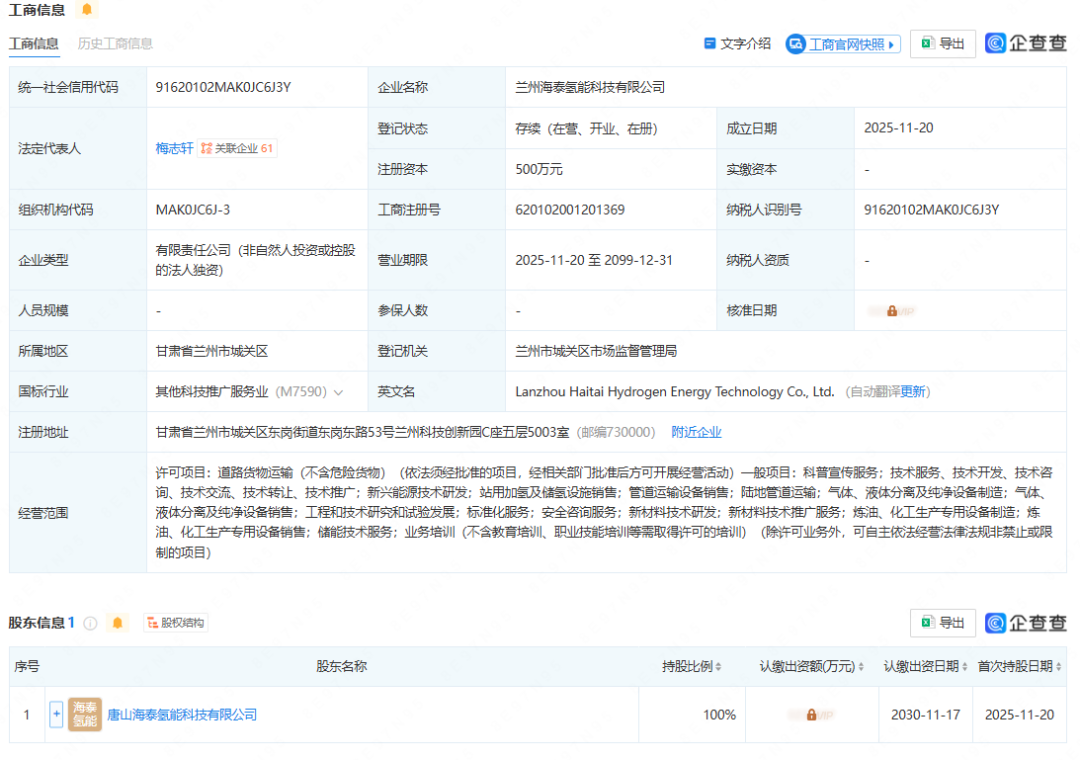 公司设立与股权结构 - 兰州海泰氢能科技有限公司于2025年11月20日成立,法定代表人为梅志轩,公司处于存续状态 [1][2] - 公司注册资本为500万元人民币,由海泰新能间接全资持股 [1][2] 业务范围与战略定位 - 公司经营范围广泛,核心聚焦于新兴能源技术研发、站用加氢及储氢设施销售以及储能技术服务 [1][2] - 业务范围同时涵盖新材料技术研发、气体与液体分离设备制造与销售、化工生产专用设备制造与销售等 [2] 注册信息与地理位置 - 公司注册地址位于甘肃省兰州市城关区兰州科技创新园,所属行业为其他科技推广服务业 [2] - 公司企业类型为有限责任公司(非自然人投资或控股的法人独资) [2]