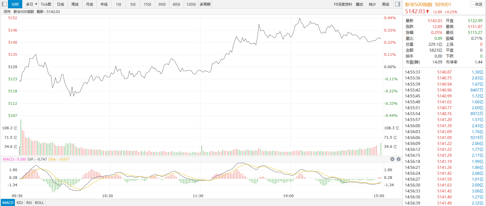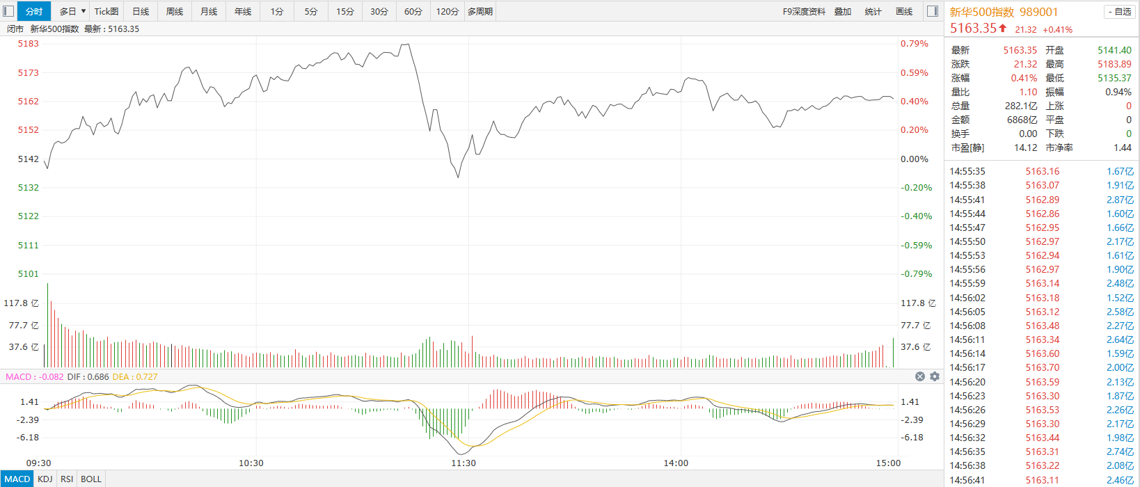 走势上看,新华500指数(989001)26日冲高回落,早盘一度涨约0.8%,午后指数窄幅震荡,最终小幅收涨。指数盘中最高触及5183.89点,最低触及 5135.37点,成分股全天总成交额报6868亿元。 成分股方面,永兴材料、中国卫星、江西铜业、中国卫通等成分股涨幅居前;工业富联、科伦药业、小商品城、北方华创等成分股跌幅靠前。 新华财经北京12月26日电(胡晨曦)新华500指数(989001)12月26日收盘涨0.41%,报5163.35点。 (文章来源:新华财经) ...