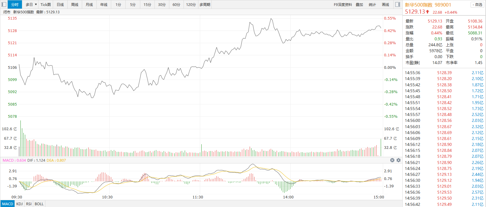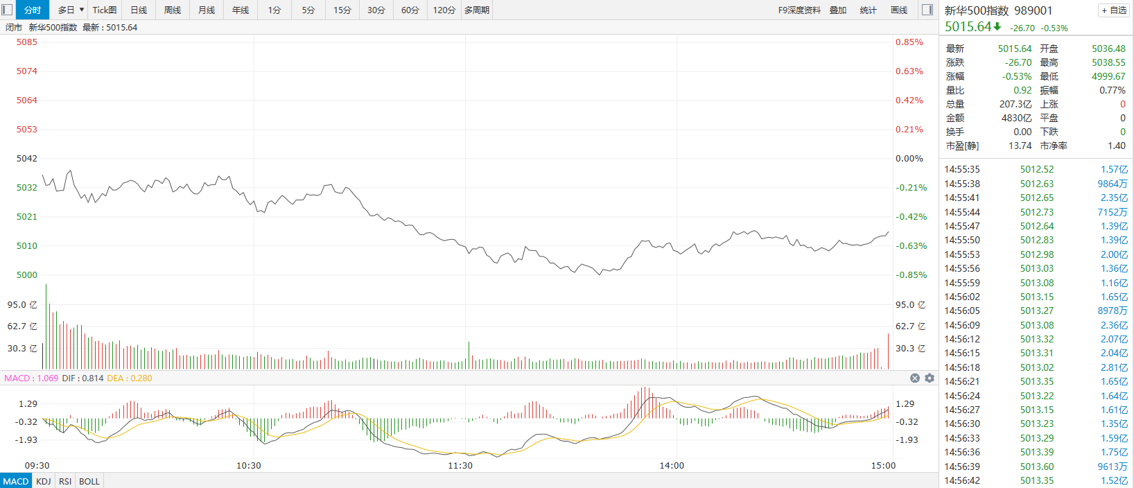编辑:王媛媛 新华财经北京12月4日电(罗浩)新华500指数(989001)12月4日收盘上涨15.67点,涨幅0.31%,报5005.03点。 走势上看,新华500指数(989001)4日早间小幅高开,指数盘初冲高回落,10时20分完成"二次下探"后出现较大幅度反弹,10时56分一度涨0.56%,此后有 所回落,午后呈窄幅整理态势,收盘时小幅上涨。 指数盘中最高触及5017.25点,最低触及4968.70点,成分股全天总成交额报4664亿元,较上一交易日小幅缩量。 成分股方面,中国卫星收于10%涨停,三花智控、长川科技、景嘉微、航天电器、中微公司等涨幅靠前;东山精密、华侨城A、中公教育、华阳股份、泸州 老窖等跌幅靠前。 新华500指数由国家金融信息平台•新华财经发布,新华指数(北京)有限公司运营维护,指数度量A股主要大中市值股票价格水平。关于新华500指数的详 细信息,请参见新华财经客户端。 转自:新华财经 ...
