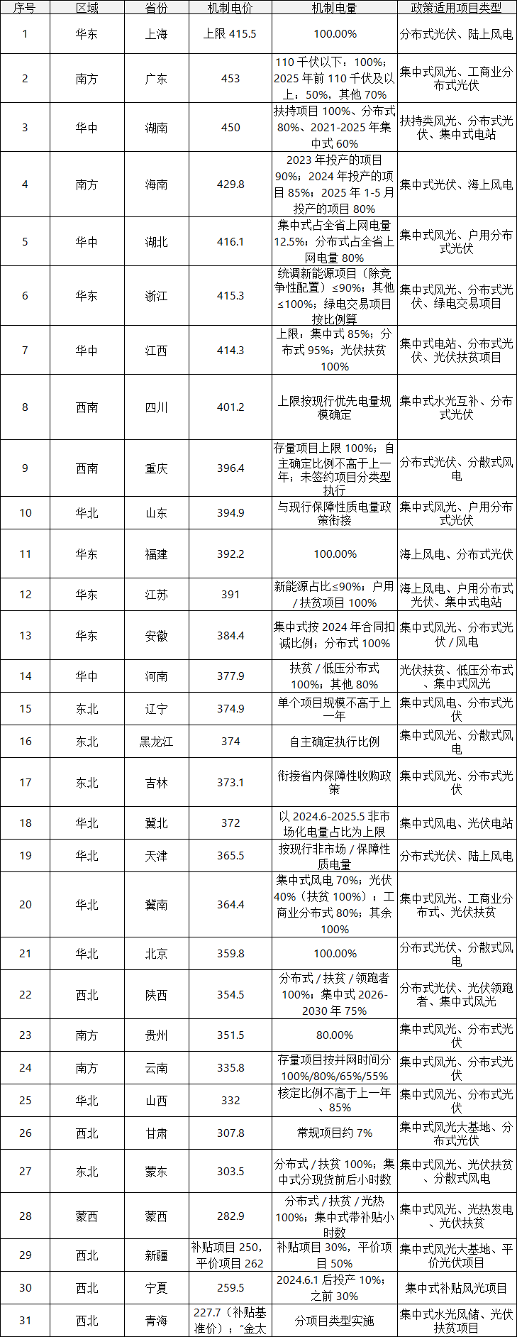 电价水平分析 - 全国各省新能源机制电价呈现明显梯度,最高为广东453元/兆瓦时,最低为青海补贴项目227.7元/兆瓦时和新疆补贴项目250元/兆瓦时 [3] - 高电价区域集中在华东和南方电网区域,如上海上限415.5元/兆瓦时、浙江415.3元/兆瓦时、湖南450元/兆瓦时,这些地区经济活跃或本地能源资源较少 [3] - 低电价区域主要为西北和蒙西,如蒙西282.9元/兆瓦时,这些地区风光资源丰富,新能源成本较低 [3] - 中间价位区域包括华北和西南,电价区间在330-390元/兆瓦时,如山西332元/兆瓦时、云南335.8元/兆瓦时 [3] 电量保障机制 - 扶持类项目如光伏扶贫、户用分布式光伏普遍获得100%电量保障,江西、湖南、安徽等地均实行此政策以稳定收益 [4] - 分布式项目电量保障比例通常高于集中式项目,江西分布式项目为95%而集中式为85%,冀南地区分布式100%而集中式风电仅70% [4] - 电量比例与投产时间挂钩,海南2023年投产项目保障90%,2024年投产降至85%,2025年上半年投产进一步降至80% [4] - 市场化程度影响电量比例,浙江参与绿电交易的项目需根据交易电量占比确定保障比例 [4] 区域政策特点 - 华东区域电价偏高,电量政策兼具保障与约束,上海和福建提供100%保障而江苏和浙江设置比例上限 [5] - 南方区域电价跨度大,电量规则精细,广东按电压等级区分(110千伏及以上50%其他70%),云南按并网时间区分(100%/80%/65%/55%) [5] - 西北和东北区域电价低,政策适配本地资源禀赋,新疆区分补贴项目30%和平价项目50%,蒙东根据现货市场前后小时数确定比例 [5]