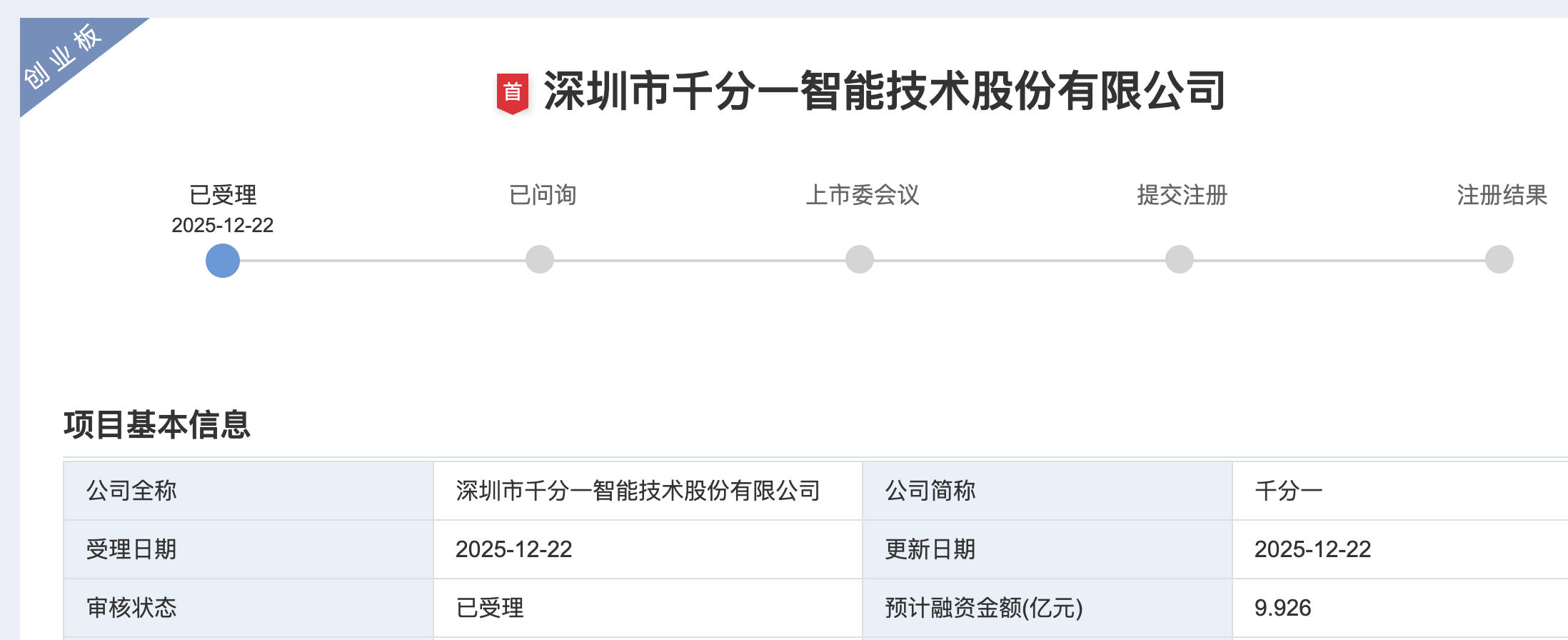 截至报告期期末,千分一共有研发人员125人,占员工总数的12.60%;公司已获授权发明专利46项,积累了新形态压力传感器、Haptic触觉反馈算法、多传 感器融合算法三项先进的核心技术,以及无线连接和智能功能技术、内置电池与电源管理技术、数字手写智能处理技术、压感自动校准算法等其他行业领先 的核心技术。 根据QYResearch统计的全球电容笔销量数据,千分一2024年全球市占率约8.5%,仅次于苹果,行业排名靠前。 业绩方面,2023年、2024年及2025年上半年,千分一实现营收分别为3.31亿元、6.36亿元和4.86亿元,净利润分别为3648.77万元、1.02亿元和8037.12万元。 本次IPO,千分一拟募资9.93亿元,投入到千分一智能制造技术(深圳)有限公司智能笔及智能生活产品生产基地项目、深圳市千分一智能技术股份有限公司 总部及研发中心建设项目及补充流动资金项目。 12月22日,深圳市千分一智能技术股份有限公司(简称"千分一")创业板IPO获深交所受理,公司拟募资9.93亿元。 招股书显示,千分一是一家全球领先的智能笔技术方案供应商,专注于为用户提供智能、便捷、拟真的感知与交互体验。公司深耕 ...