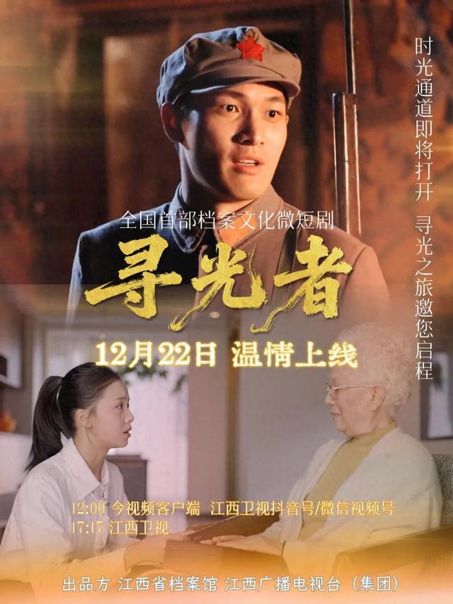 全国首部档案文化微短剧 12月22日 温情上线 一份份尘封的档案,一次次神奇的穿越。当宝盒发光,历史之门悄然打开…… 江西省档案馆联合江西卫视策划制作的全国首部档案文化横屏微短剧《寻光者》12月22日温情上线! 跟随档案馆青年讲解员艾兰的脚步,一起回到90多年前的那段峥嵘岁月,开启一场跨越时空的"寻光之 旅" 一起期待这场融合历史纪实与温暖情感的光影旅程! 出品方 江西省档案馆 江西广播电视台 (集团) ld 光通道即将打开 寻尤之旅邀您 江西卫视抖音号/微信视频号 12:00 今视频客户端 17:17 江西日初 《寻光者》12月22日12:00今视频客户端、江西卫视抖音号、江西卫视微信视频号;12月22日17:17江西 卫视。 我们不见不散! 来源:江西卫视综合 ...